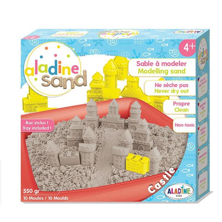 En savoir +Coffret de sable à modeler pour enfant. Ce sable de la marque Aladine ne sèche pas à l'air libre. Utilisez-le avec des outils de modelage. Ce coffret contient des moules pour construire un château-fort, des recharges de sable (550 g ) ainsi qu'un bac gonflable. Jeu tout aussi ludique et créatif pour les enfants à partir de 3 ans.