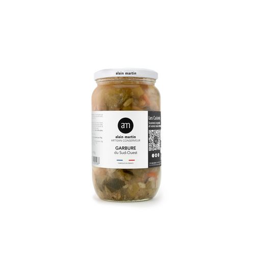 Légumes 40% minimum (haricots blancs, poireaux, pommes de terre, navets, carottes, choux, oignons), eau, viande 16% (manchon de canard, lard), sel, arômes, persil. Origine des viandes : France