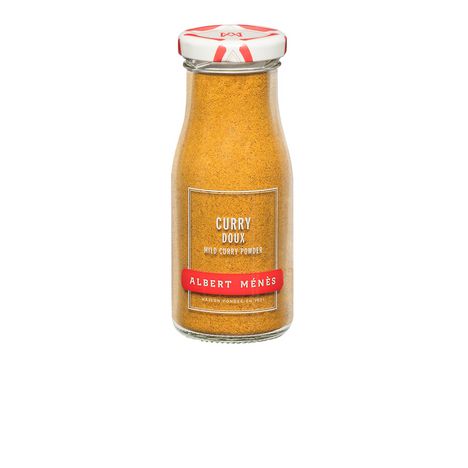 Le curry doux Albert Ménès est originaire de Thailande, il est composé de curcuma, d'un mélange de coriandre, trigonelle, gingembre, piment, poivre blanc, sel, cumin, ail, chili, farine de pois chiche, et laurier.