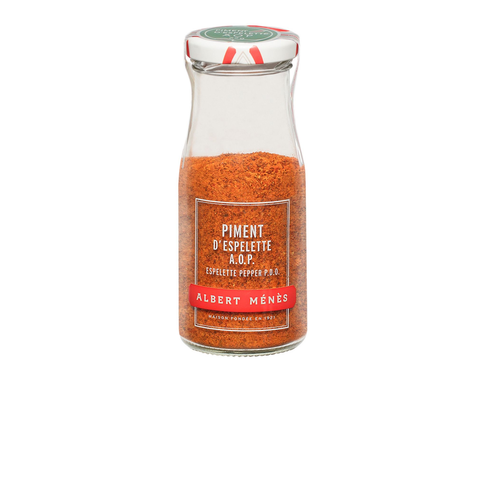 ALBERT MENES Piment d'Espelette AOP 65g Le Piment d'espelette ne peut être récolté que sur dix communes dans le Pays Basque. Il bénéficie d'une Appellation d'Origine Protégée (A.O.P). Ces conditions agro-climatiques garantissent donc une qualité constante et exceptionnelle. Parfait pour pour r