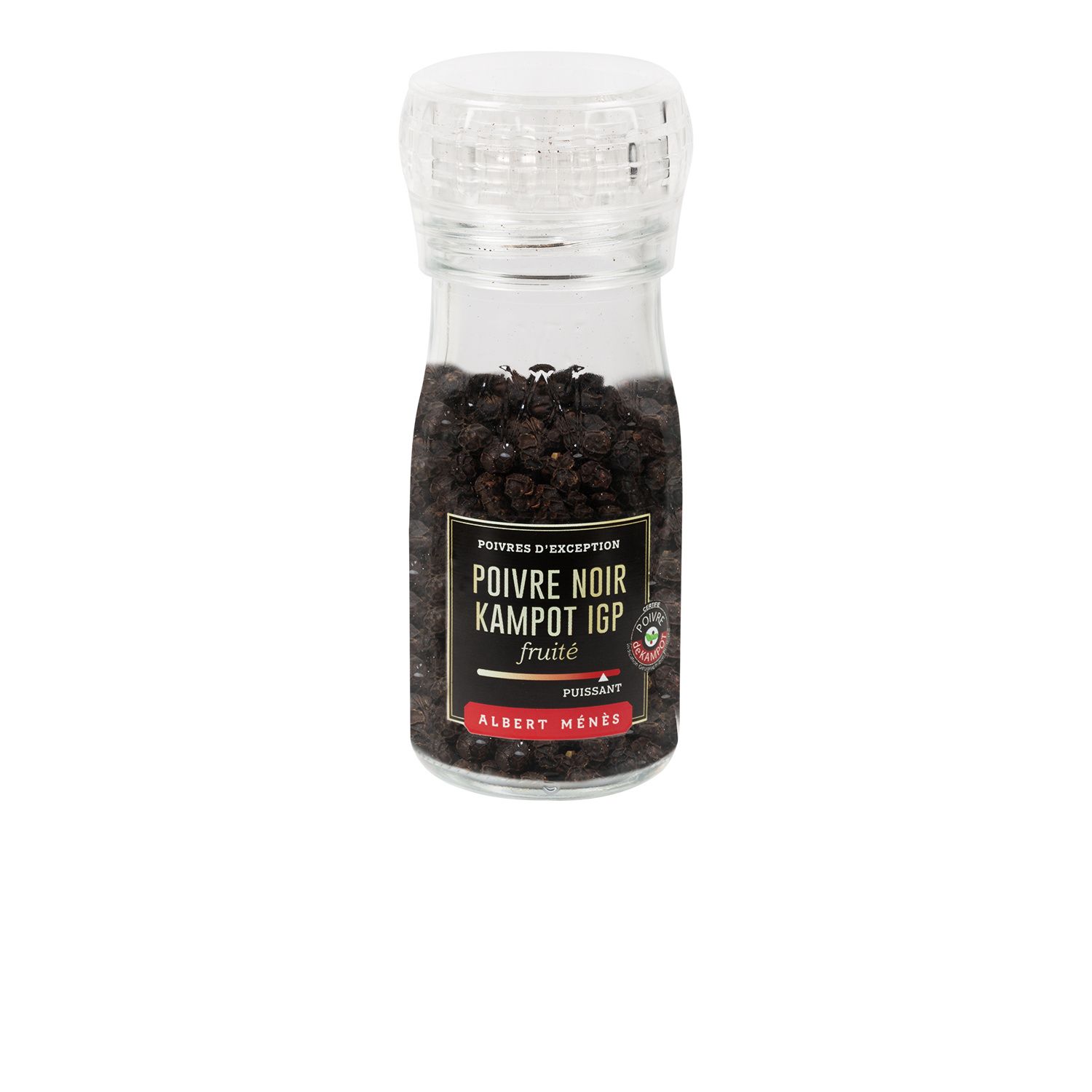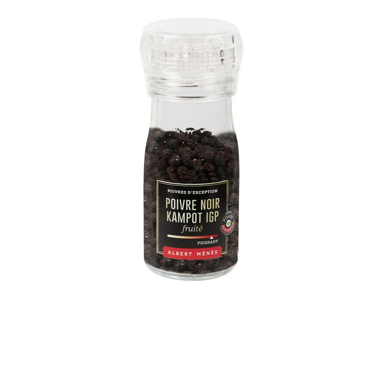 ALBERT MENES Poivre noir de Kampot IGP en grains en moulin 50g Dans un soucis de développement durable, le poivre noir de Kampot d'Albert Ménès, est cultivé et produit dans l'exploitation de Fair Farms. Labellisé IGP ( (Indication Géographique Protégée), le poivre de Kompot est considéré comme