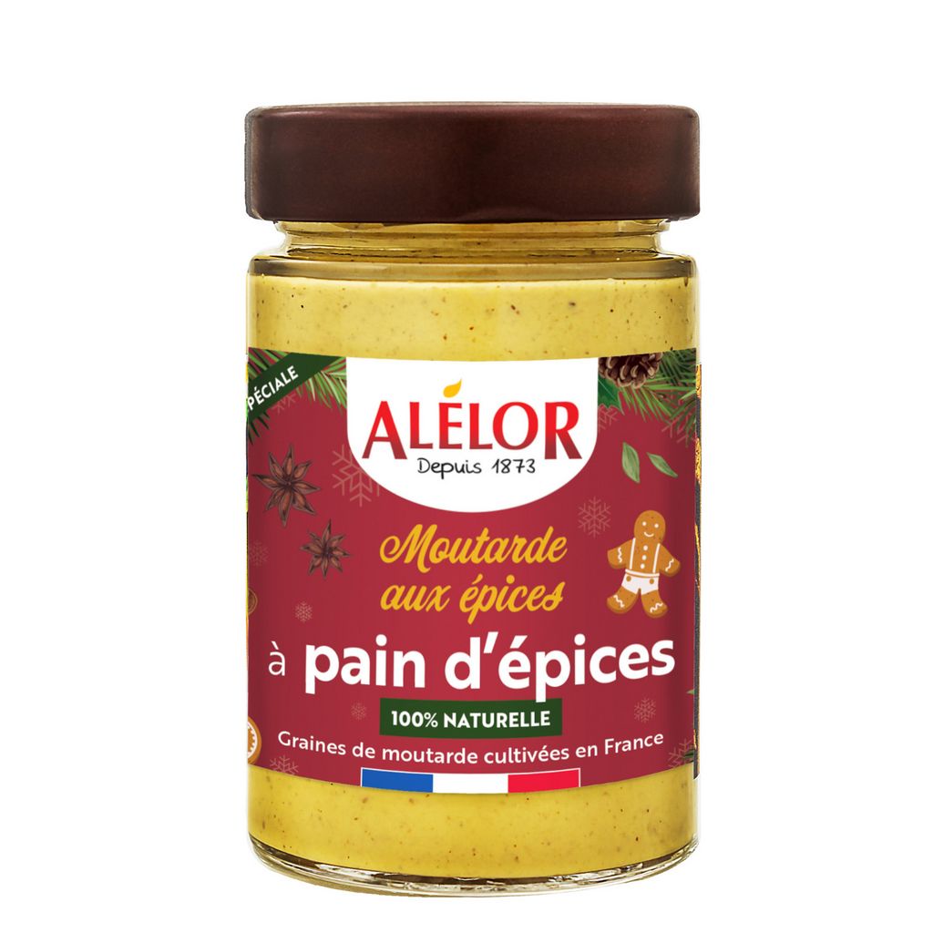 Alélor a imaginée la Moutarde aux épices à Pain d'Epices qui vous plonge toute l'année dans la féerie de Noël. Cette moutarde douce est aromatisée avec du miel et les épices traditionnelles du pain d'épices d'Alsace, cardamome, anis étoilé, cannelle et girofle. Elle se savoure avec le jambon en croûte et la volaille, ou permet de réaliser des sauces relevées. La Moutarde aux épices à Pain d'épices est fabriquée en Alsace avec des graines de moutarde françaises. Elle est naturelle, sans additifs, sans colorants et sans conservateurs.