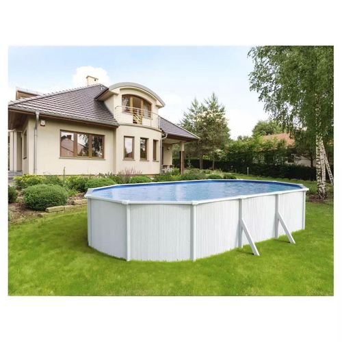 Piscine SAPHIR métal hors sol, ovale, blanche , avec deux jambes de force de chaque côté, de 6,35x 3,90m de dimension extérieure et 6,10x3,60m de dimension intérieure. Hauteur de 1,32m avec une profondeur d'eau de 1,20m, volume d'eau 24m3.Paroi 40/100ème en acier ondulé galvanisé à chaud, pré-laquée . Poteaux verticaux en acier galvanisé à chaud. Margelles largeur 15 cm. Composée d'un liner uni bleu de 42/100ème haute résistance, un kit de filtration de 6m3/h équipé d'un pré-filtre + balles filtrantes Aqualoon, skimmer + buse de refoulement, pré-découpe skimmer et buse de refoulement, échelle métal de sécurité 2 x 4 marches et un tapis de sol. Garantie 2 ans sur accessoires et bassin.