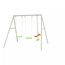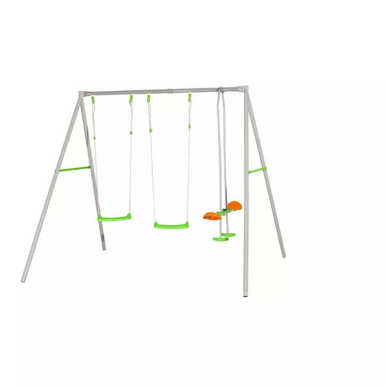 2 balançoires injectées vertes, réglables par tendeur coloris vert. Sièges face à face injectés coloris orange, ergonomiques pour de meilleures sensations. Repose pieds verts et montants coloris gris. Siège bébé avec coque plastique aux formes enveloppantes conçue pour un meilleur confort. Poignée avec entre-jambes assurant une grande sécurité. Ceinture de sécurité ventrale.