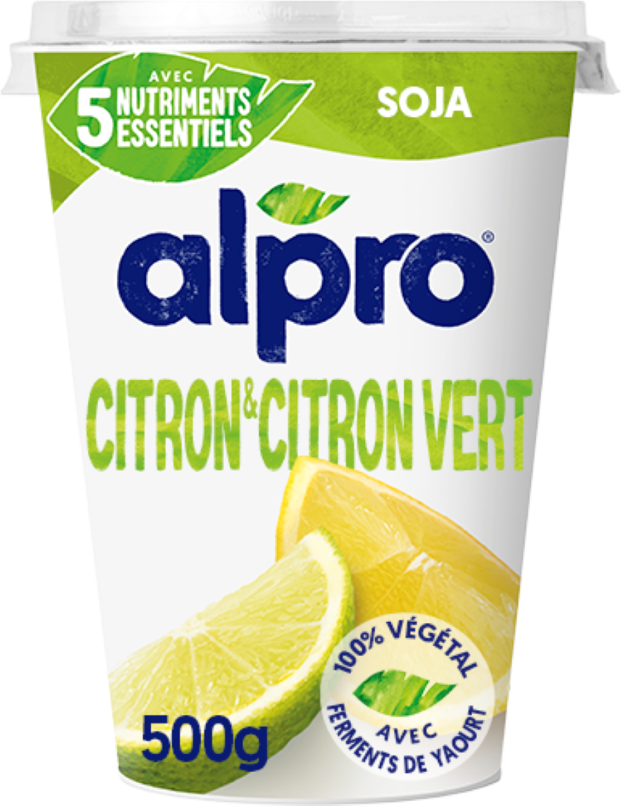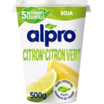 INGRÉDIENTS: base de soja (84,3%) (eau, fèves de soja décortiquées (9,7%)), sucre, sirop de glucose-fructose, mélange citron-citron vert (3,4%) (jus de citron à base de concentré (1,7%), citron (1,1%), jus de citron vert à base de concentré (0,6%)), correcteurs d'acidité (acide citrique, citrates de sodium), stabilisant (pectines), calcium (phosphate tricalcique), sel marin de table, concentré de carotte et potiron, antioxydants (extrait riche en tocophérols, esters d'acides gras de l'acide ascorbique), arôme, arôme naturel de citron avec d'autres arômes naturels, vitamines (B2, B12, D2), ferments de yaourt (S. thermophilus, L. bulgaricus).
