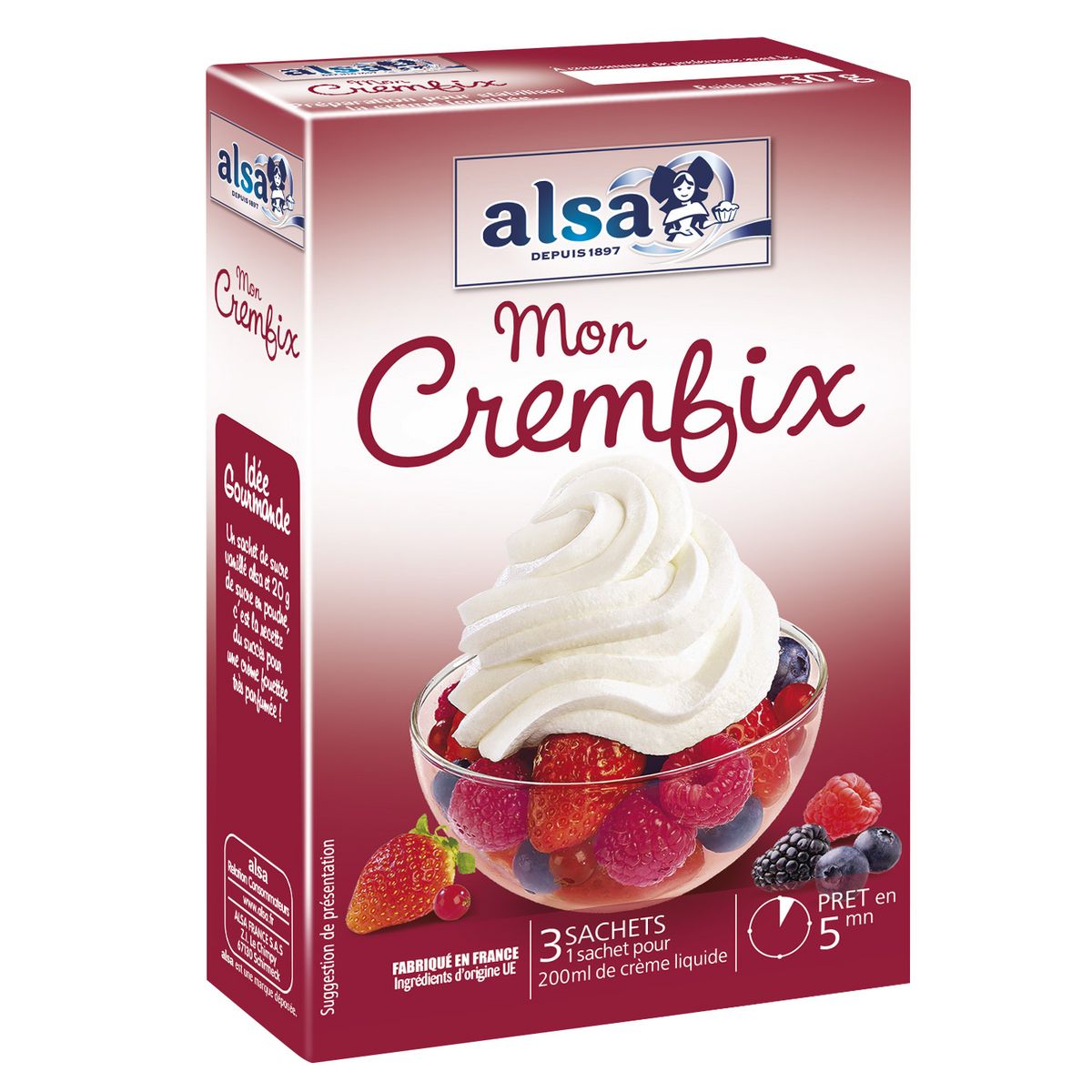 Avec Mon Cremfix alsa, vous avez la garantie d’une crème fouettée ferme et qui tient ! Prêt en 5 minutes, il suffit d'ajouter 200ml (20 cl) de crème fraîche liquide et 25g de sucre en poudre