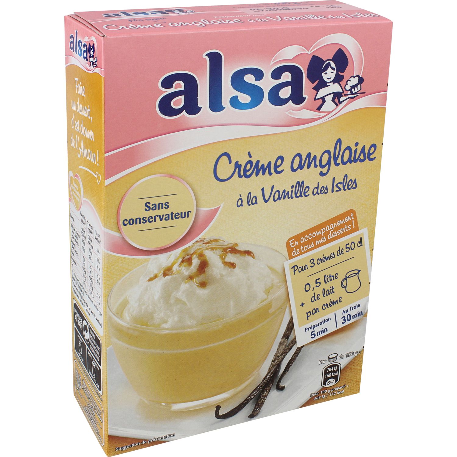 Préparation pour Crème anglaise à la Vanille des Isles Alsa – Crème Anglaise à la Vanille des Isles 300g – Préparation pour dessert facile et rapide La Crème Anglaise à la Vanille des Isles alsa® vous permet, en quelques minutes seulement, d’ajouter une touche de gourmandise à tous vos gâteaux. •Une texture généreuse pour une crème anglaise gourmande ; •Une saveur incomparable apportée par la vanille Bourbon ; •3 crèmes anglaises, d’1/2L chacune, rapides et faciles à réaliser ; •Source de calcium ; •Sans conservateur. a super Crème Anglaise à la Vanille des Isles alsa® : un dessert frais et si simple à réaliser ! La Crème Anglaise à la Vanille des Isles alsa® vous permet, en quelques minutes seulement, d’ajouter une touche de gourmandise à tous vos gâteaux. Rapide et facile à préparer 1.Je porte à ébullition 1/2 litre de lait dans une casserole. 2.Quand le lait bout fortement, je retire la casserole du feu et je verse immédiatement le contenu d'un sachet dans le lait. Je remue à l'aide d'un fouet pour obtenir une crème lisse. 3.Je verse la crème dans un saladier et je laisse refroidir, tout en remuant de temps en temps. 4.Je couvre le saladier avant de le placer au réfrigérateur pendant au moins 30 min afin que la crème épaississe. 5.Je la remue une dernière fois avant de napper mes desserts. C'est prêt ! Idée recette : l’île flottante INGRÉDIENTS : •1 sachet de préparation pour Crème Anglaise à la Vanille des Isles alsa® •1 sachet de Sucre Vanillé des Isles alsa® •50 cL de lait •6 œufs •100 g de sucre •1 cuillère à soupe d’huile •1 pincée de sel PRÉPARATION DE LA RECETTE : 1.Préchauffez votre four à 150°C (Th.5). Préparez la Crème Anglaise alsa® en suivant le mode d’emploi du paquet. Réservez au frais. 2.Séparez le blanc et le jaune des 6 œufs. Montez les blancs en neige très ferme en leur ajoutant une pincée de sel et un sachet de Sucre Vanillé alsa®. 3.Versez délicatement les blancs en neige dans des ramequins badigeonnés d’un peu d’huile ou des moules en silicone et faites cuire au four au bain-marie pendant 30 minutes, jusqu’à ce que le dessus commence à blondir. Démoulez alors délicatement sur la crème anglaise refroidie. 4.Mettez au frais l’île flottante jusqu’au moment de servir. 5.Avant de servir, versez le sucre dans une petite casserole et faites chauffer jusqu’à obtenir un caramel blond. Versez-le directement sur les îles flottantes en formant des lacets. Astuce alsa® : Pour une cuisson express, vous pouvez mettre les blancs d’oeufs au micro-ondes pendant 1 min. Et si besoin, les remettre de 20 s en 20 s jusqu’à obtention de la cuisson désirée. Alsa : faire un dessert, c’est donner de l’Amour ! Chez alsa®, nous voulons faire rimer la pâtisserie, le plaisir et la gourmandise et ne laisser que le meilleur à nos consommateurs : la joie et la fierté de finaliser leurs desserts. Alsa® est le partenaire idéal de vos desserts au quotidien et de vos moments festifs. Avec notre large gamme d’aides à la pâtisserie et de desserts à préparer, débutants comme confirmés peuvent créer un momentde partage et de plaisir gourmand en famille ou entre amis. Avec nos préparations pour gâteaux alsa®, c'est toute la simplicité et la praticité de préparer un gâteau en moins de 5 min. Avec alsa®, l’amour ça se voit !