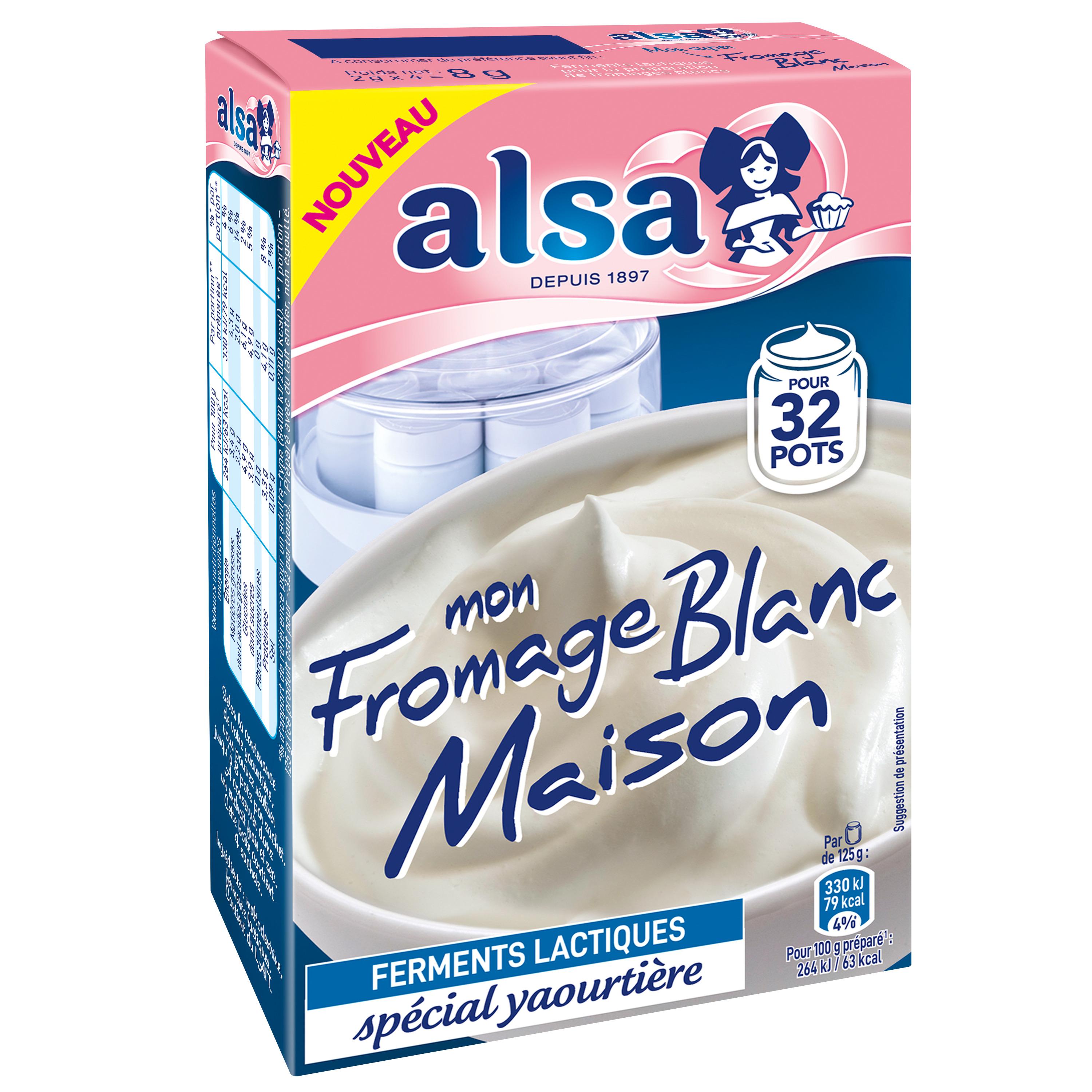 Grâce aux ferments lactiques alsa, réalisez un délicieux fromage blanc maison ! Versez un sachet dans 1 L de lait, 12 heures en yaourtière et c’est prêt ! Facile à préparer et adapté aux yaourtières classiques ou avec paniers égouttoirs. Pour réaliser jusqu'à 32 pots.
