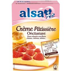 Alsa – Crème Pâtissière 390g – Préparation pour dessert facile et rapide La Crème Pâtissière alsa® vous permet, en 5 minutes seulement, d’ajouter une touche de gourmandise à toutes vos pâtisseries : choux, tartes et éclairs. Le résultat ? Un dessert frais, fait maison et facile à préparer ! •Une texture généreuse pour une crème pâtissière gourmande ; •Une saveur incomparable apportée par l’arôme vanille ; •3 crèmes pâtissières, d’1/2L chacune, rapides et faciles à réaliser ; •Source de calcium ; •Sans conservateur. a super Crème Pâtissière alsa® : un dessert frais et si simple à réaliser ! La Crème Pâtissière alsa® vous permet, en 5 minutes seulement, d’ajouter une touche de gourmandise à toutes vos pâtisseries : choux, tartes et éclairs. Le résultat ? Un dessert frais, fait maison et facile à préparer ! Rapide et facile à préparer 1.Je porte à ébullition 1/2 litre de lait dans une casserole. 2.Quand le lait bout fortement, je retire la casserole du feu et je verse immédiatement le contenu d'un sachet dans le lait. Je remue à l'aide d'un fouet pour obtenir une crème lisse et épaisse. 3.Je verse la crème dans un saladier et je laisse refroidir, tout en la remuant de temps en temps. 4.Je couvre le saladier avant de le placer au réfrigérateur pendant au moins 30 min afin que la crème épaississe. 5.Je la remue une dernière fois avant de l'utiliser dans mes desserts. C'est prêt ! Idée recette : la tarte aux fraises INGRÉDIENTS : •1 sachet de préparation pour Crème Pâtissière Onctueuse alsa® •1/2 L de lait •1 kg de fraises •1 pâte à tarte sablée ou brisée PRÉPARATION DE LA RECETTE : 1.Je préchauffe mon four à 180°C (Th.6). 2.Je prépare ou j’utilise une pâte à tarte sablée ou brisée pour foncer mon moule à tarte. 3.Je pique la pâte à la fourchette. Pour éviter que la pâte ne gonfle, je la recouvre d’un disque de papier sulfurisé et je répartis des billes de cuisson. Je fais cuire le fond de tarte 20 minutes jusqu’à ce que les bords dorent légèrement. Lorsque le fond de tarte est cuit, je laisse refroidir 15 minutes à l’air libre. 4.Pendant ce temps, je lave les fraises et je les équeute. 5.Je prépare la Crème Pâtissière Onctueuse alsa® en suivant les instructions présentes sur le paquet puis je la laisse refroidir. Je garnis généreusement votre fond de tarte de crème pâtissière. Je dispose les fraises sur la crème et je sers. Bonne dégustation ! Alsa : faire un dessert, c’est donner de l’Amour ! Chez alsa®, nous voulons faire rimer la pâtisserie, le plaisir et la gourmandise et ne laisser que le meilleur à nos consommateurs : la joie et la fierté de finaliser leurs desserts. Alsa® est le partenaire idéal de vos desserts au quotidien et de vos moments festifs. Avec notre large gamme d’aides à la pâtisserie et de desserts à préparer, débutants comme confirmés peuvent créer un moment de partage et de plaisir gourmand en famille ou entre amis. Avec nos préparations pour gâteaux alsa®, c'est toute la simplicité et la praticité de préparer un gâteau en moins de 5 min. Avec alsa®, l’amour ça se voit ! Préparation pour Ma super Crème pâtissière
