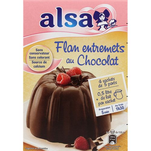 Alsa – Flan Entremets au Chocolat 232g – Préparation pour dessert facile et rapide Le Flan Entremets au Chocolat alsa® est une façon gourmande de consommer le lait dont nous avons besoin chaque jour grâce à sa recette enrichie en minéraux de lait. Un dessert frais, fait maison et facile à préparer ! •Une texture généreuse pour un flan gourmand ; •Un bon goût de chocolat ; •3 flans, de 5 parts chacun, rapides et faciles à réaliser ; •Source de calcium ; •Sans conservateur. on super Flan Entremets au Chocolat alsa® : un dessert frais et si simple à réaliser ! Le Flan Entremets au Chocolat alsa® est une façon gourmande de consommer le lait dont nous avons besoin chaque jour grâce à sa recette enrichie en minéraux de lait. Un dessert frais, facile à préparer avec la satisfaction du fait-maison ! Rapide et facile à préparer 1.Je porte à ébullition ½ litre de lait. 2.Je retire la casserole du feu et je verse immédiatement le contenu d’un sachet dans le lait bouillant. 3.Je remue vivement au fouet. 4.Je verse dans 5 ramequins et je laisse refroidir. 5.Je mets mes ramequins au réfrigérateur pendant 1h30. C’est prêt ! Pour préparer le Flan Entremets au Chocolat alsa® dans un grand moule, je double les quantités en versant 2 sachets dans 1 litre de lait bouillant. Pour varier les plaisirs, découvrez également le Flan Entremets au bon goût Vanille alsa®, le Flan Entremets au bon goût Caramel alsa® et le Flan Entremets au bon goût Pistache alsa®. Idée recette : les verrine poires-chocolat façon Belle-Hélène INGRÉDIENTS : •1 paquet de Flan Entremets au Chocolat alsa® •½ L de lait •2 poires •25 cl de crème fleurette •1 cuillère à soupe de sucre semoule •2 sachets de Sucre Vanilliné alsa® PRÉPARATION DE LA RECETTE : 1.Je réalise mon Flan Entremets au Chocolat alsa® selon les instructions présentes au dos du pack, et je le verse au fond de mes verrines. Je place le tout au réfrigérateur pendant 1h30. 2.Une fois les 1h30 écoulées, je répartis mes poires épluchées et coupées en petits dés dans mes verrines. 3.Pour réaliser ma crème chantilly alsa®, je verse la crème fleurette, juste sortie du réfrigérateur dans un saladier froid. 4.J’ajoute mon sucre et mes sachets de Sucre Vanilliné alsa®. 5.Je bats ma crème à l’aide d’un batteur électrique doucement, puis j’augmente la vitesse jusqu’à ce que ma crème “épaississe” et je verse dans mes verrines. 6.J’ajoute des brisures de chocolat en topping pour un dessert plus gourmand. Astuce : Pour les plus gourmands, je peux faire revenir mes poires dans un peu de sucre et de beurre. Bonne dégustation ! Alsa : faire un dessert, c’est donner de l’Amour ! Chez alsa®, nous voulons faire rimer la pâtisserie, le plaisir et la gourmandise et ne laisser que le meilleur à nos consommateurs : la joie et la fierté de finaliser leurs desserts. Alsa® est le partenaire idéal de vos desserts au quotidien et de vos moments festifs. Avec notre large gamme d’aides à la pâtisserie et de desserts à préparer, débutants comme confirmés peuvent créer un moment de partage et de plaisir gourmand en famille ou entre amis. Avec nos préparations pour gâteaux alsa®, c'est toute la simplicité et la praticité de préparer un gâteau en moins de 5 min. Avec alsa®, l’amour ça se voit ! Préparation pour Flan entremets au Chocolat