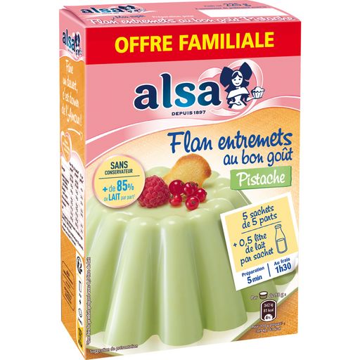 Pour préparer le flan Alsa dans un grand moule, je double les quantités en versant 2 sachets dans 1 litre de lait bouillant.