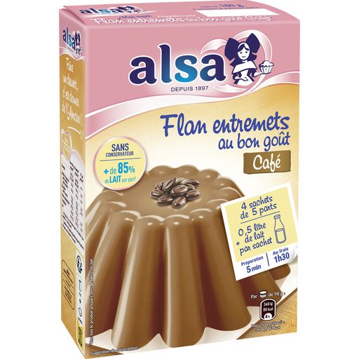 Un nouveau parfum dans la gamme de flan entremets Alsa ! Découvrez le délicieux flan entremets Alsa au bon goût café, un super dessert source de calcium grâce à sa recette enrichie en minéraux du lait..