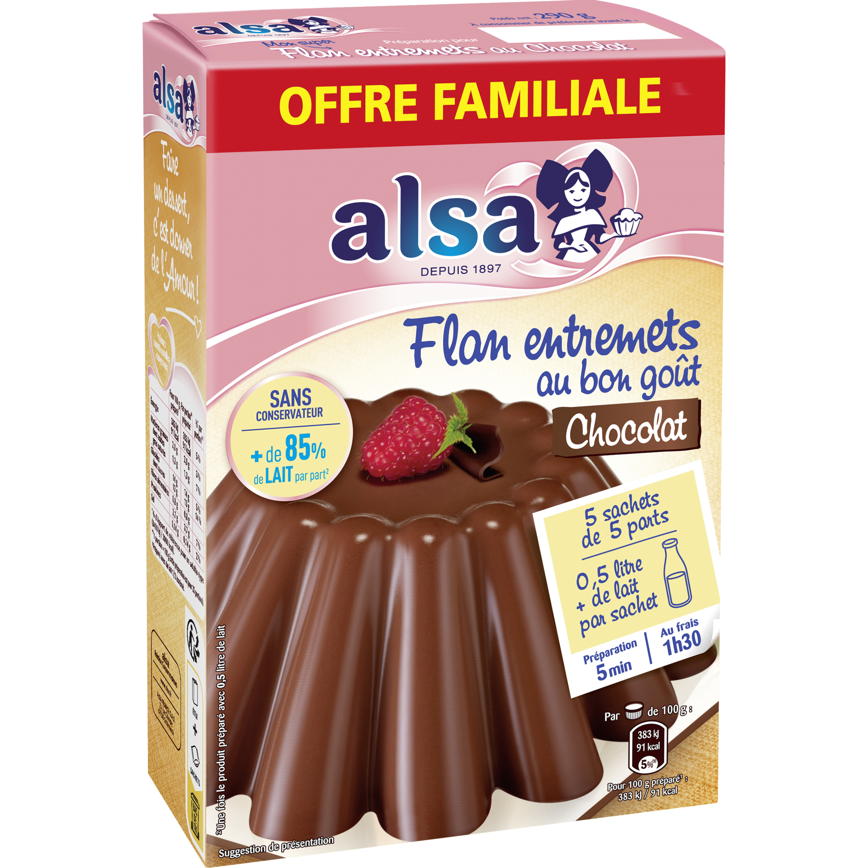 Préparation : 5 min Au frais : 1h30Il me faut : 0,5 L de lait par sachet1. Je porte à ébullition 1/2 L de lait. 2. Je retire la casserole du feu et je verse immédiatement le contenu d'un sachet dans le lait bouillant. 3. Je remue vivement au fouet. Je chauffe à nouveau 2 min sur feu moyen, tout en remuant. 4. Je verse dans 5 ramequins et je laisse refroidir. 5. Je place mes ramequins au réfrigérateur pendant 1h30. C'est prêt ! Pour préparer le flan Alsa dans un grand moule, je double les quantités en versant 2 sachets dans 1 L de lait bouillant.