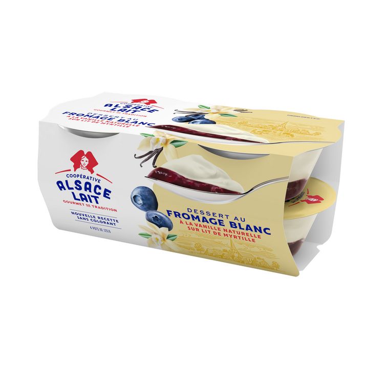 LAIT* écrémé pasteurisé, CREME* pasteurisée : 19,8%, sucre : 13%, myrtille (purée et morceaux) : 6%, amidon, gélatine de porc, arôme naturel de vanille, arômes naturels, épaississant : pectines, FERMENTS LACTIQUES (*Origine : France)