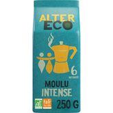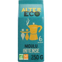 100% café torréfié et moulu Arabica et Robusta issu de l'agriculture biologique et issu du commerce équitable contrôlé selon le référentiel Fair for Life.