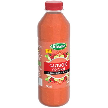 - 100% légumes frais - Tomate Concombre Poivron Oignon Pain de riz Assaisonnement Le gazpacho Tradicional° Alvalle® est élaboré selon la recette traditionnelle espagnole : des légumes frais gorgés de soleil, alliés au parfum subtil de l'huile d'olive vierge extra. °Tradicional = Traditionnel N° 1 en Espagne* *La marque Alvalle est N°1 en Espagne sur le marché des Soupes Froides en valeur. Panels distributeur 2019. Soupe froide de légumes.