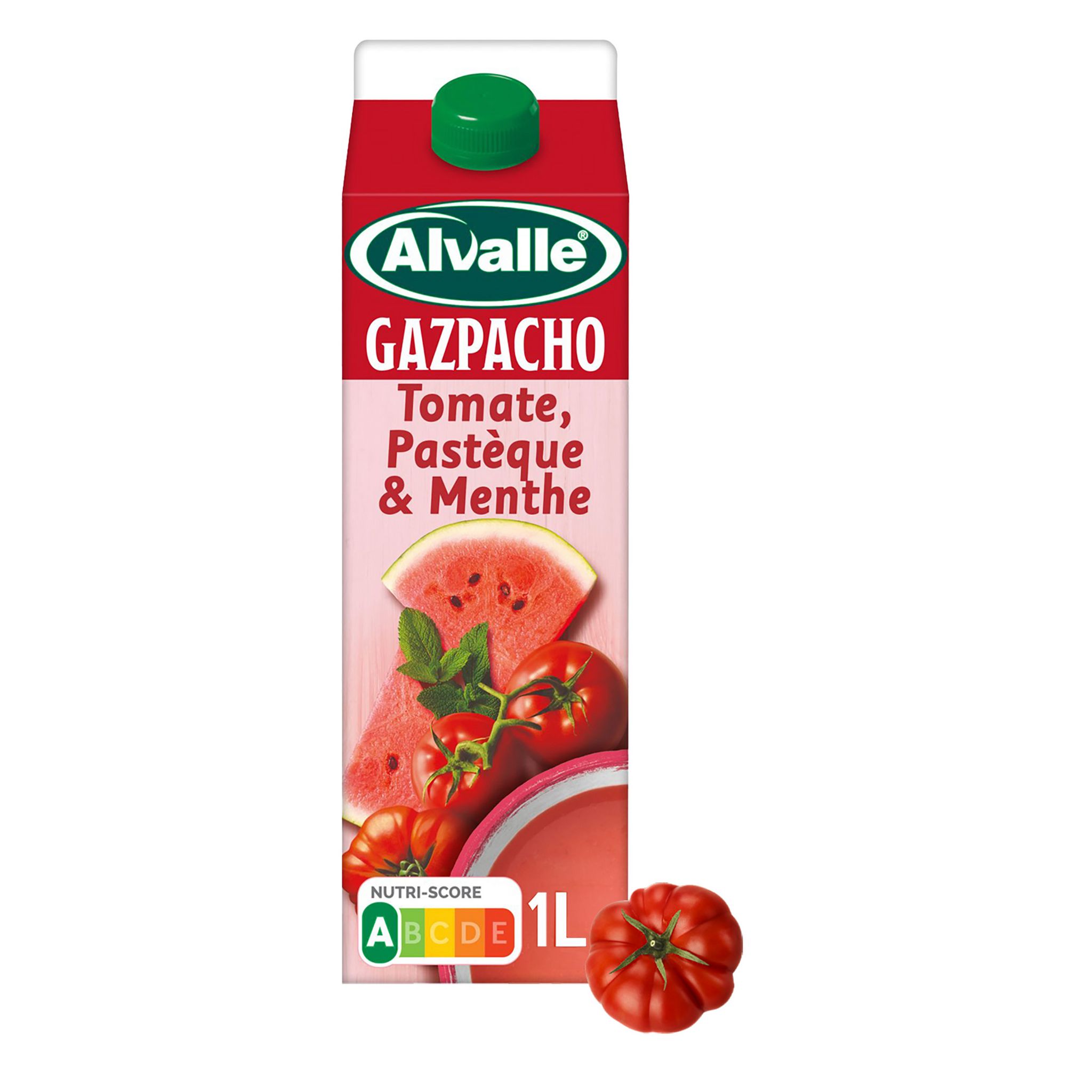tomate (36%),pastèque (24%),eau,concombre,jus de citron,sel de mer,sucre,huile d'olive vierge extra (0,2%),menthe (0,15%),teneur en fruits et légumes: 76%