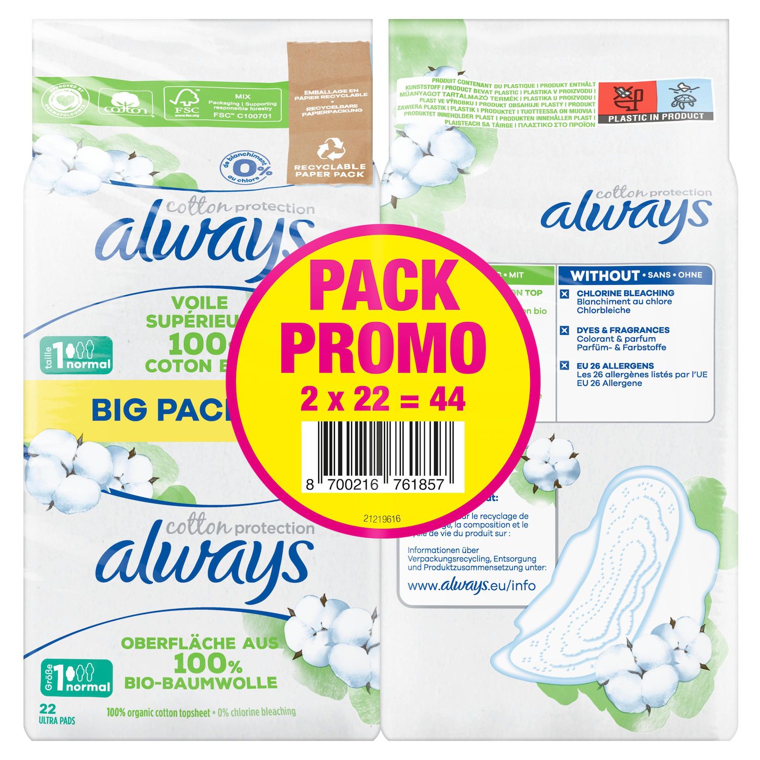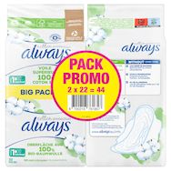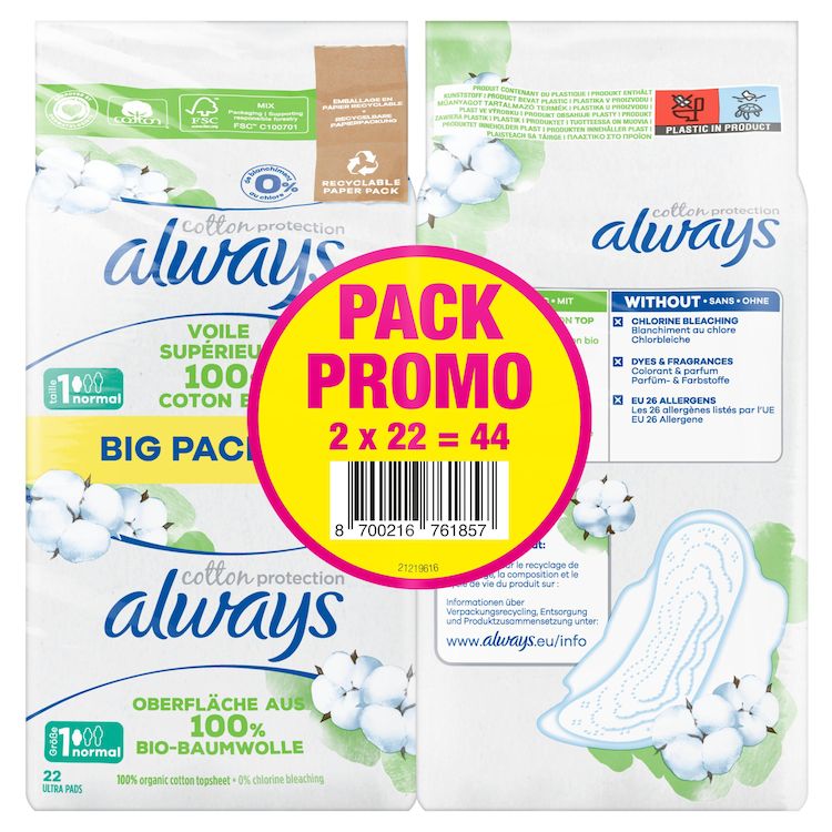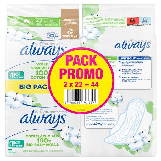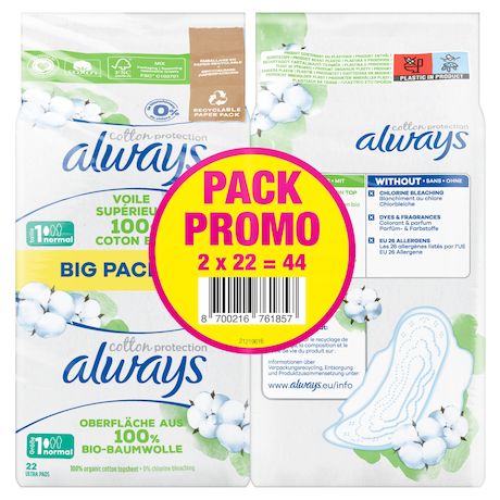 Les serviettes Always Cotton Protection prennent soin de vous avec un voile supérieur 100% coton biologique dans un emballage en papier. Les serviettes sont sans parfum. Elles ont été approuvées par les dermatologues de la Skin Health Alliance (Alliance pour la Santé de la Peau) et certifiées par Cotton Inc. Leur cœur ultra absorbant transforme le liquide en gel pour vous garantir la protection Always. Les serviettes Normal sont particulièrement adaptées aux flux légers avec une lingerie de taille S ou M ou aux flux moyens avec une lingerie de taille S. Pour en savoir plus sur les produits Always, veuillez consulter le site Web d'Always.