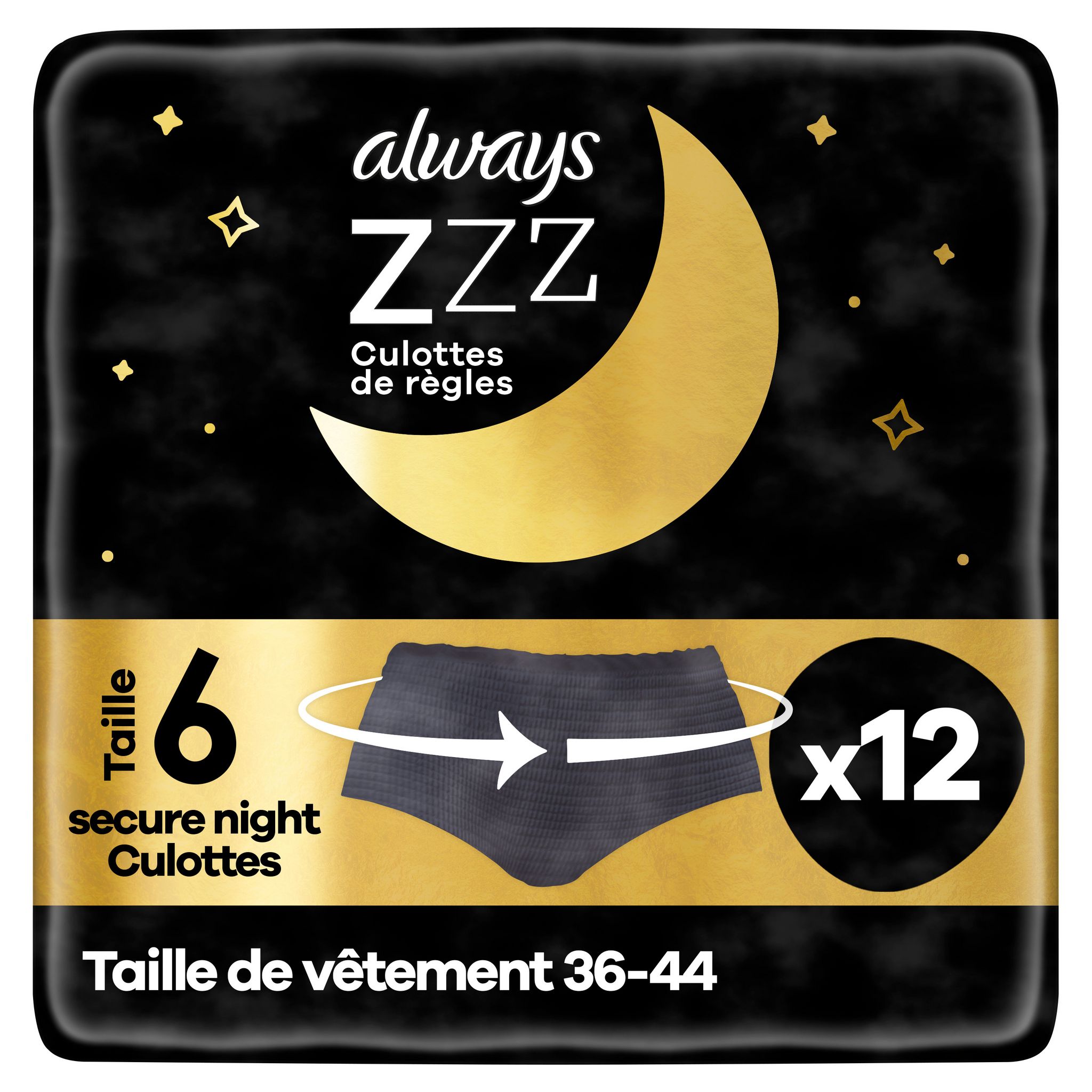 Vos règles vous empêchent de dormir ? Découvrez les culottes de règles Always Zzz et leur protection 360°, pour des nuits sans soucis. Les culottes de règles jetables Always Zzz sont faites d'une matière micro-aérée douce comme de la soie. Elles absorbent autant que 5 serviettes Always Ultra. Elles sont conçues pour s'adapter à votre corps et rester en place.