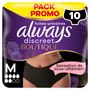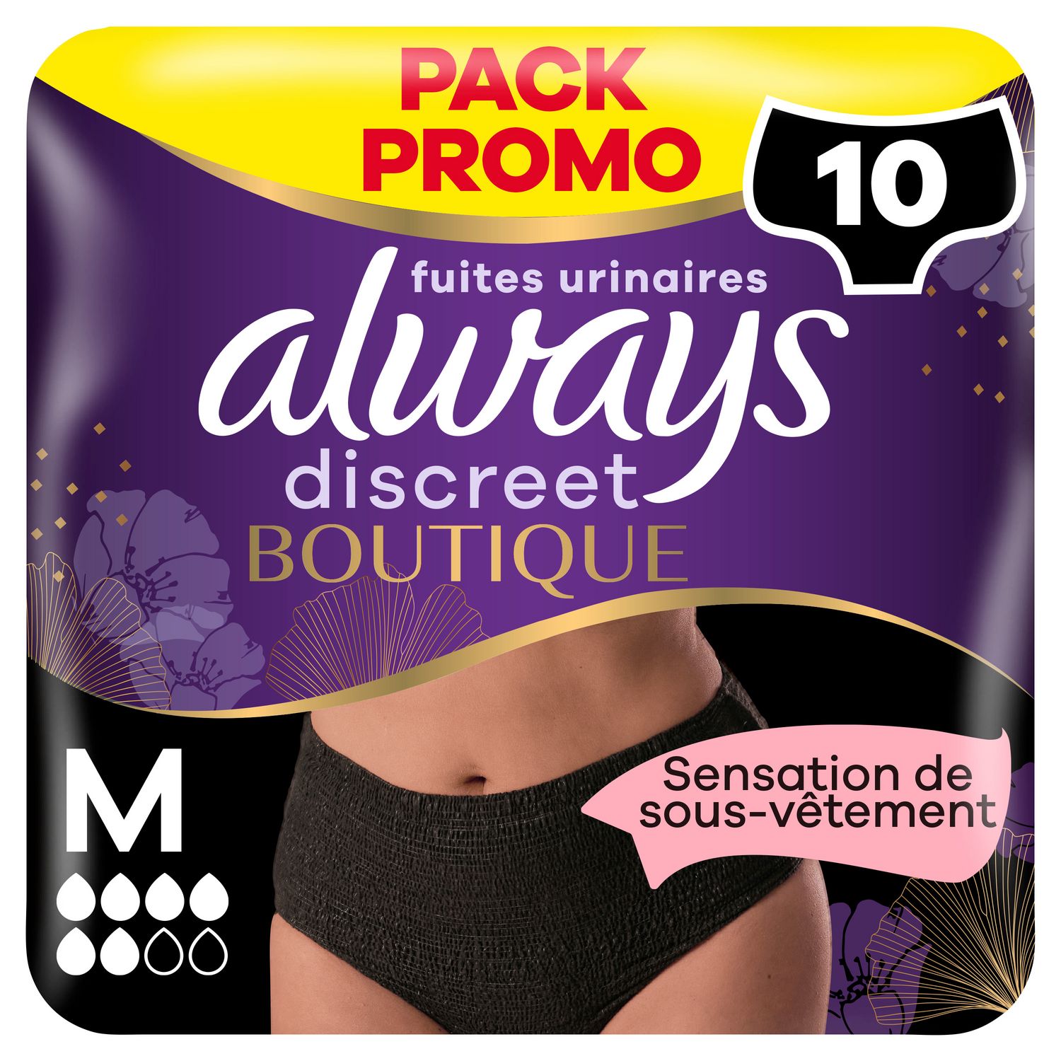 Grâce aux culottes Always Discreet Boutiques noires Plus M. les fuites urinaires ne vous gênent plus. Découvrez une incroyable protection contre les fuites urinaires qui ressemble à vos sous-vêtements favoris. Un cœur ultra absorbant et ultra fin transforme le liquide en gel et absorbe instantanément l'humidité, pour que vous vous sentiez fraîche et sûre, en toutes circonstances. Avec leur matière soyeuse et leur design féminin qui épouse les formes de votre corps, vous aurez l'impression de porter un véritable sous-vêtement. Les culottes Always Discreet Boutique vous permettent de vous sentir confiante et élégante sans vous soucier des fuites urinaires. Essayez les culottes noires pour fuites urinaires taille M Always Discreet Boutique. Qui a dit que les femmes ne devraient avoir qu'un style de culottes pour fuites urinaires ? Découvrez les culottes noires Always Discreet Boutique taille basse pour fuites urinaires.