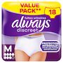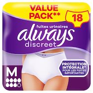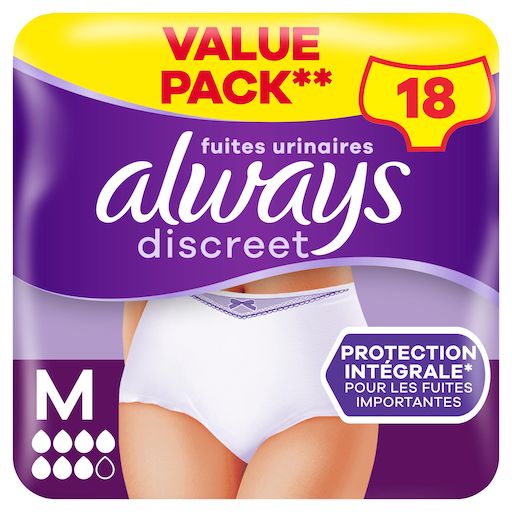 Ne laissez pas les fuites urinaires vous empêcher de vivre votre vie pleinement. Les culottes pour fuites urinaires Always Discreet Plus M restent bien en place et vous aident ainsi à vivre votre vie pleinement, même en cas de fuites urinaires importantes et inattendues. Les culottes ultra absorbantes sont dotées d'une technologie RapidAbsorb qui aide à absorber les fuites et les odeurs en quelques secondes. Les doubles barrières anti-fuites LeakGuards aident à prévenir les fuites là où elles se produisent le plus. Leur design FormFit à 360° et leur cœur vous offrent un maintien confortable optimal, de sorte que vous puissiez vivre votre vie pleinement en profitant d'une protection qui vous va incroyablement bien. Essayez aussi les culottes pour fuites urinaires Always Discreet Plus M. Convient aussi à l'incontinence postpartum, après l'accouchement. Si vous recherchez des couleurs différentes et une discrétion incroyable, choisissez nos sous-vêtements Always Discreet Boutique, disponibles en noir et beige.