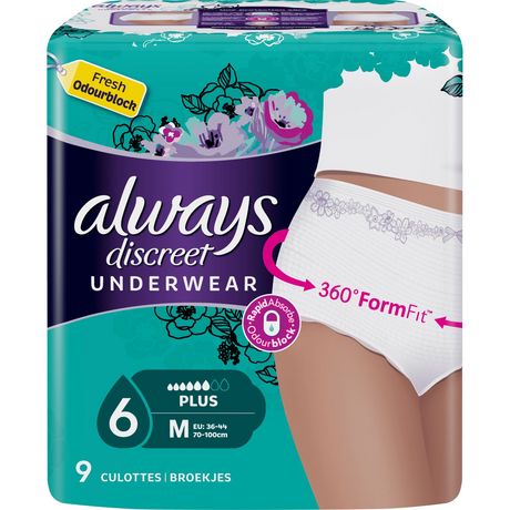 Les Culottes Pour Fuites Urinaires Always Discreet sont dotées des technologies RapidAbsorb et OdourBlock et d’un cœur design confortable