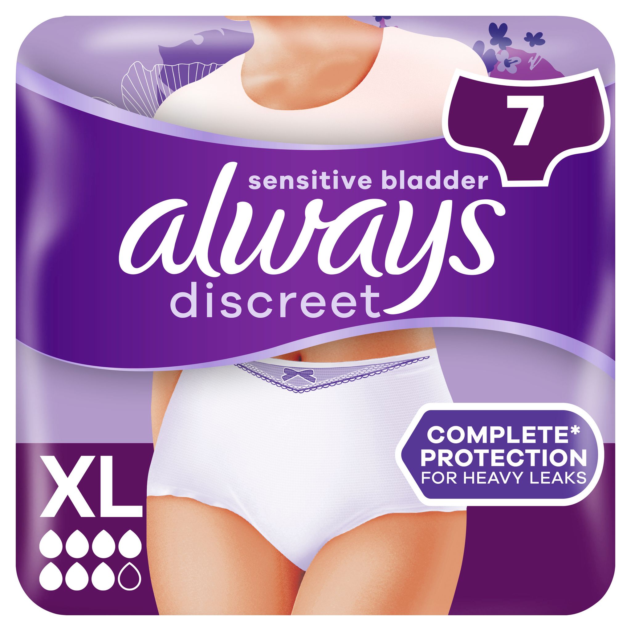 Les culottes Pour Fuites Urinaires Always Discreet sont dotées des technologies RapidAbsorb et OdourBlock et d'un cœur design confortable