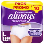 Ne laissez pas les fuites urinaires vous empêcher de vivre votre vie pleinement. Les culottes pour fuites urinaires Always Discreet Plus L restent bien en place et vous aident ainsi à vivre votre vie pleinement, même en cas de fuites urinaires importantes et inattendues. Les culottes ultra absorbantes sont dotées d'une technologie RapidAbsorb qui aide à absorber les fuites et les odeurs en quelques secondes. Les doubles barrières anti-fuites LeakGuards aident à prévenir les fuites là où elles se produisent le plus. Leur design FormFit à 360° et leur cœur vous offrent un maintien confortable optimal, de sorte que vous puissiez vivre votre vie pleinement en profitant d'une protection qui vous va incroyablement bien. Essayez aussi les culottes pour fuites urinaires Always Discreet Plus L. Convient aussi à l'incontinence postpartum, après l'accouchement. Si vous recherchez des couleurs différentes et une discrétion incroyable, choisissez nos sous-vêtements Always Discreet Boutique, disponibles en noir et beige.