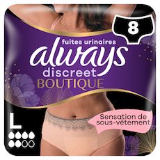 Grâce aux culottes Always Discreet Boutiques beiges Plus L, les fuites urinaires ne vous gênent plus. Découvrez une incroyable protection contre les fuites urinaires qui ressemble à vos sous-vêtements favoris. Un cœur ultra absorbant et ultra fin transforme le liquide en gel et absorbe instantanément l'humidité, pour que vous vous sentiez fraîche et sûre, en toutes circonstances. Avec leur matière soyeuse et leur design féminin qui épouse les formes de votre corps, vous aurez l'impression de porter un véritable sous-vêtement. Les culottes Always Discreet Boutique vous permettent de vous sentir confiante et élégante sans vous soucier des fuites urinaires. Essayez les culottes beiges pour fuites urinaires taille L Always Discreet Boutique. Qui a dit que les femmes ne devraient avoir qu'un style de culottes pour fuites urinaires ? Découvrez les culottes noires Always Discreet Boutique taille basse pour fuites urinaires.