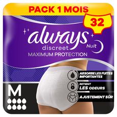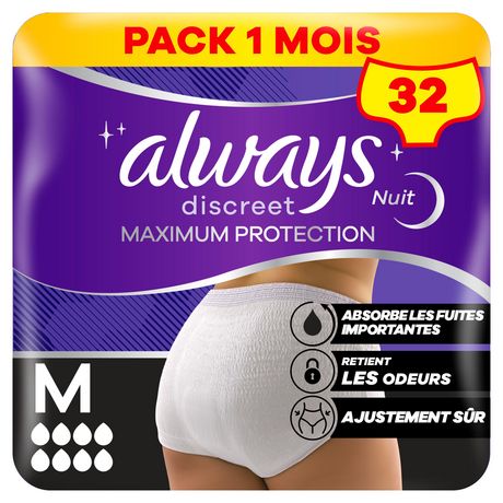 Ne laissez pas les fuites urinaires vous empêcher de vivre votre vie pleinement. Les culottes Always Discreet Protection maximale 8 gouttes protègent contre les fuites importantes grâce à leur structure multi-couches qui absorbe et retient les fuites en quelques secondes. La technologie des culottes Protection maximale identifie et retient les odeurs pour une vraie tranquillité d'esprit, de jour comme de nuit. La protection maximale s'accompagne d'un confort maximal grâce à un ajustement qui épouse les courbes, vous faisant sentir protégée et en sécurité.