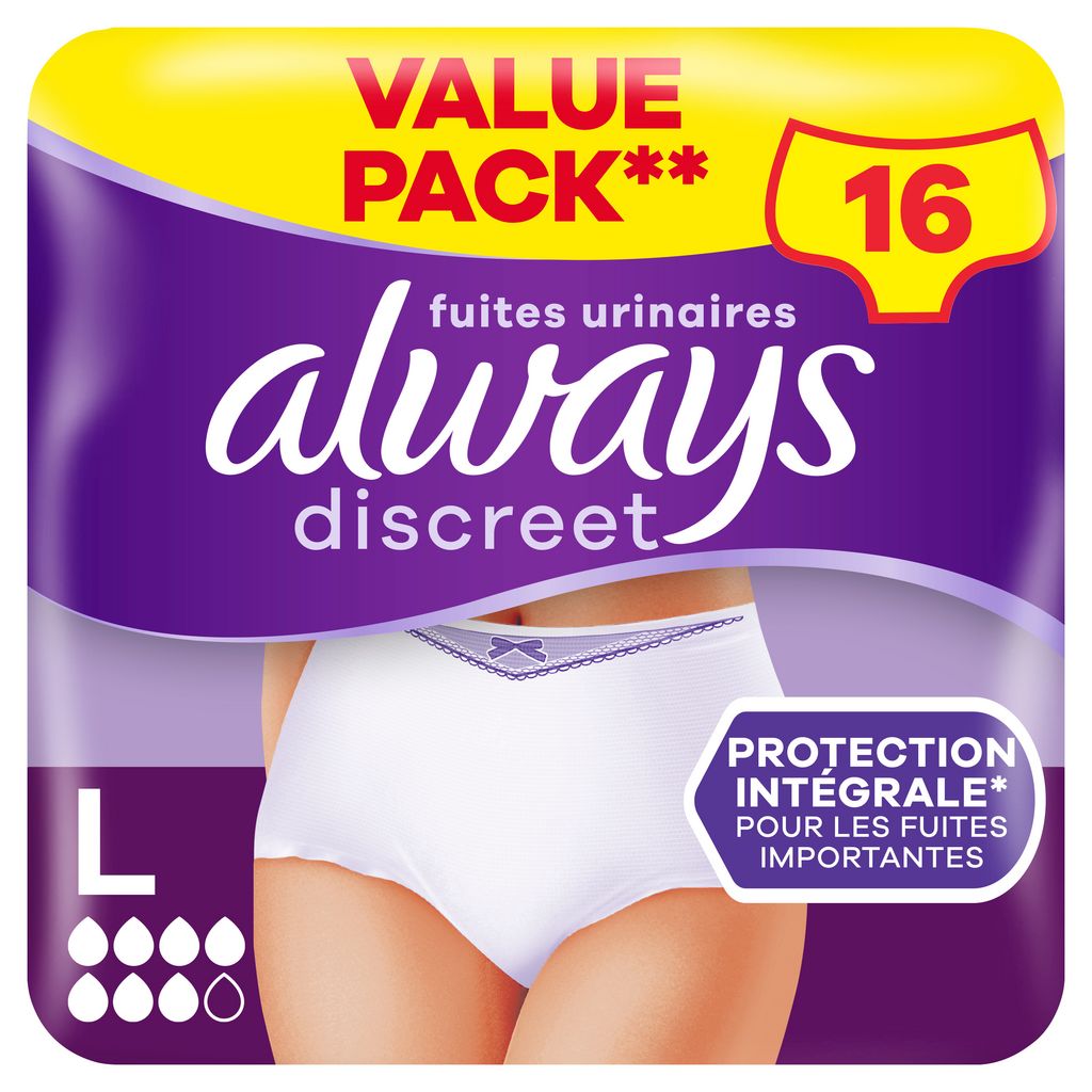 Ne laissez pas les fuites urinaires vous empêcher de vivre votre vie pleinement. Les culottes pour fuites urinaires Always Discreet Plus L restent bien en place et vous aident ainsi à vivre votre vie pleinement, même en cas de fuites urinaires importantes et inattendues. Les culottes ultra absorbantes sont dotées d'une technologie RapidAbsorb qui aide à absorber les fuites et les odeurs en quelques secondes. Les doubles barrières anti-fuites LeakGuards aident à prévenir les fuites là où elles se produisent le plus. Leur design FormFit à 360° et leur cœur vous offrent un maintien confortable optimal, de sorte que vous puissiez vivre votre vie pleinement en profitant d'une protection qui vous va incroyablement bien. Essayez aussi les culottes pour fuites urinaires Always Discreet Plus L. Convient aussi à l'incontinence postpartum, après l'accouchement. Si vous recherchez des couleurs différentes et une discrétion incroyable, choisissez nos sous-vêtements Always Discreet Boutique, disponibles en noir et beige.