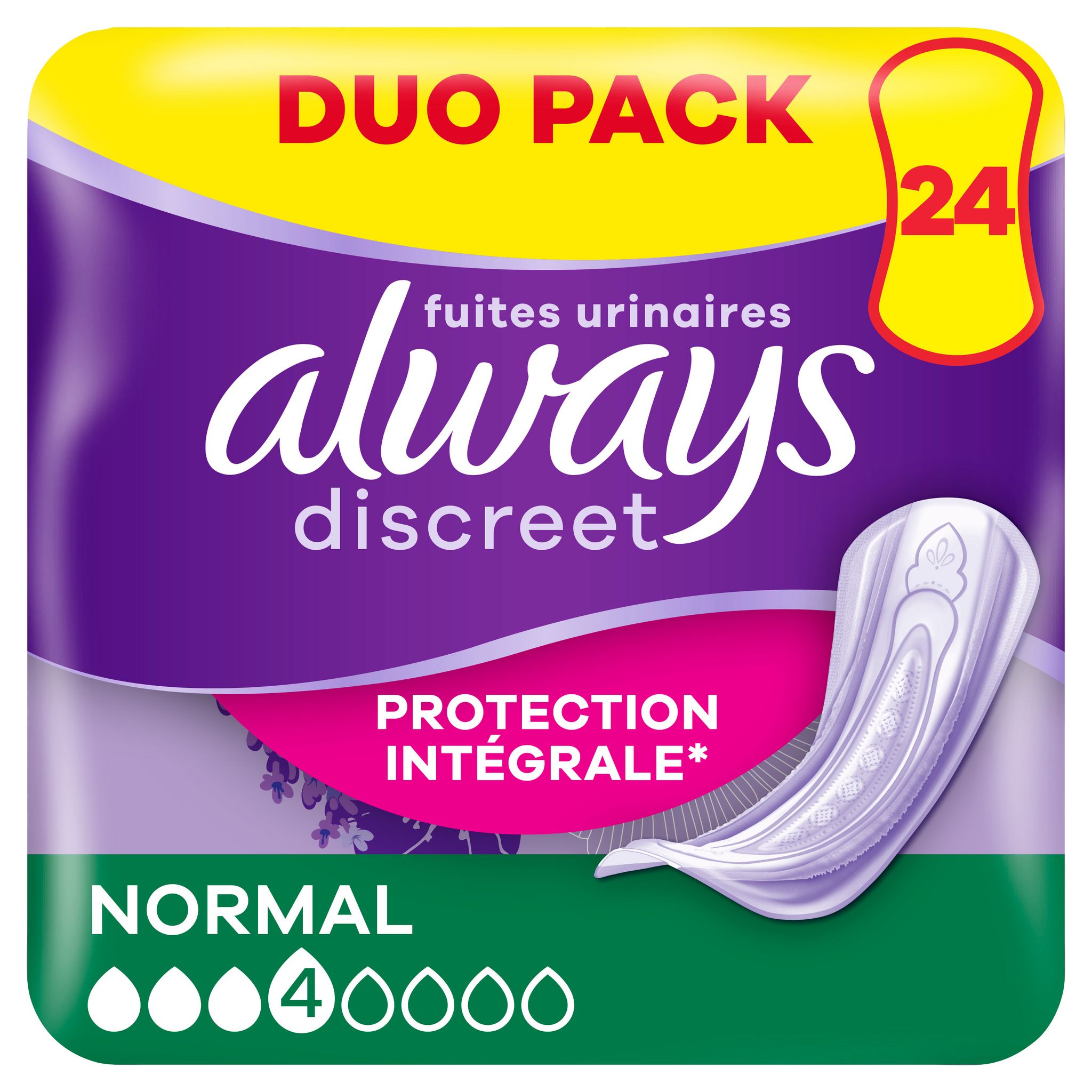 Les serviettes pour fuites urinaires Always Discreet Normal vous offrent une protection intégrale* une discrétion optimale. Chaque serviette a été conçue pour vous offrir une protection fiable contre les fuites, une protection anti-odeurs, la technologie InstantAbsorb et une sensation douce sur la peau tout en épousant les formes de votre corps. Les serviettes Always Discreet Normal vous offrent une protection fiable et la discrétion que vous attendez en cas de fuites urinaires lorsque vous éternuez ou riez, pour que vous puissiez vous sentir en toute confiance. *Basé sur nos 5 dimensions d'une protection fiable : protection sûre contre les fuites urinaires, absorption immédiate, protection anti-odeurs, design discret, doux pour la peau