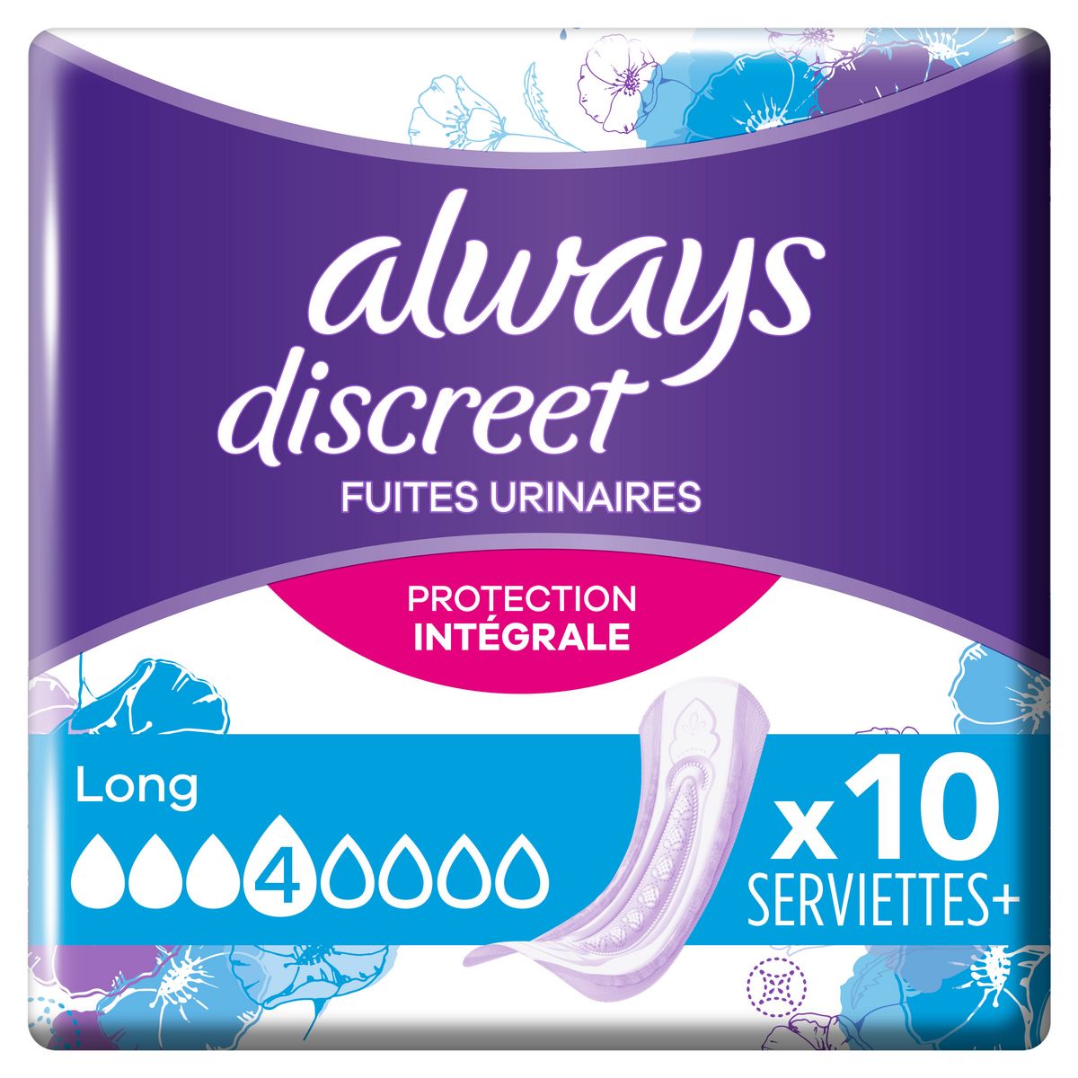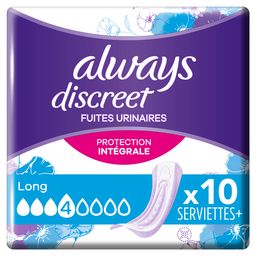 Les serviettes pour fuites urinaires Always Discreet Long vous offrent une protection intégrale* très discrète. Chaque serviette a été conçue pour vous offrir une protection fiable contre les fuites, une neutralisation des odeurs, la technologie InstantAbsorb et une sensation douce sur la peau tout en épousant les formes de votre corps. Les serviettes Always Discreet Long vous offrent une protection fiable et la discrétion que vous attendez en cas de fuites urinaires lorsque vous éternuez ou riez, pourque vous puissiez vous sentir en toute confiance. Always Discreet est un dispositif médical. Lire les instruction d'usage sur l'emballage