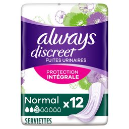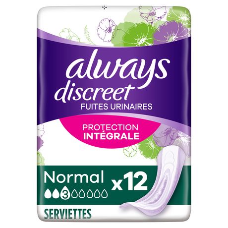 Les serviettes pour fuites urinaires Always Discreet Normal vous offrent une protection intégrale* une discrétion optimale. Chaque serviette a été conçue pour vous offrir une protection fiable contre les fuites, une neutralisation des odeurs, la technologie InstantAbsorb et une sensation douce sur la peau tout en épousant les formes de votre corps. Les serviettes Always Discreet Normal vous offrent une protection fiable et la discrétion que vous attendez en cas de fuites urinaires lorsque vous éternuez ou riez, pour que vous puissiez vous sentir en toute confiance. *Basé sur nos 5 dimensions d'une protection fiable : protection sûre contre les fuites urinaires, absorption immédiate, technologie exclusive de neutralisation des odeurs, design discret, doux pour la peau