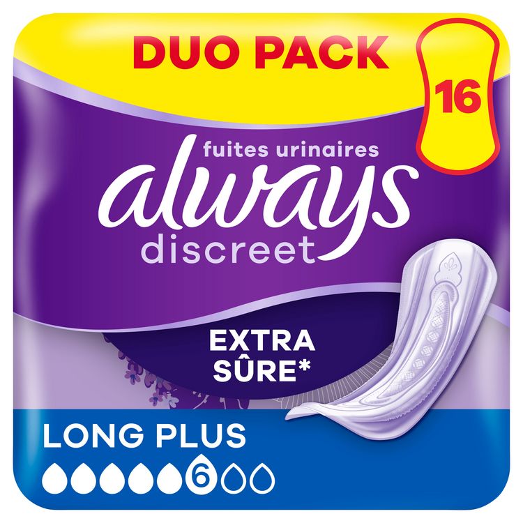 Idéal pour les fuites plus importantes. Les serviettes pour fuites urinaires Always Discreet Long Plus sont extra sûres. Conçues pour vous offrir une protection et une absorption supplémentaires afin que vous ne vous inquiétiez plus de vos fuites. Leur structure offre une protection sûre avec un cœur ultra fin, vous n'aurez donc pas à faire de compromis sur le confort ou la protection. Les serviettes Always Discreet Long Plus vous offrent une protection optimale en cas de fuites urinaires lorsque vous éternuez ou riez