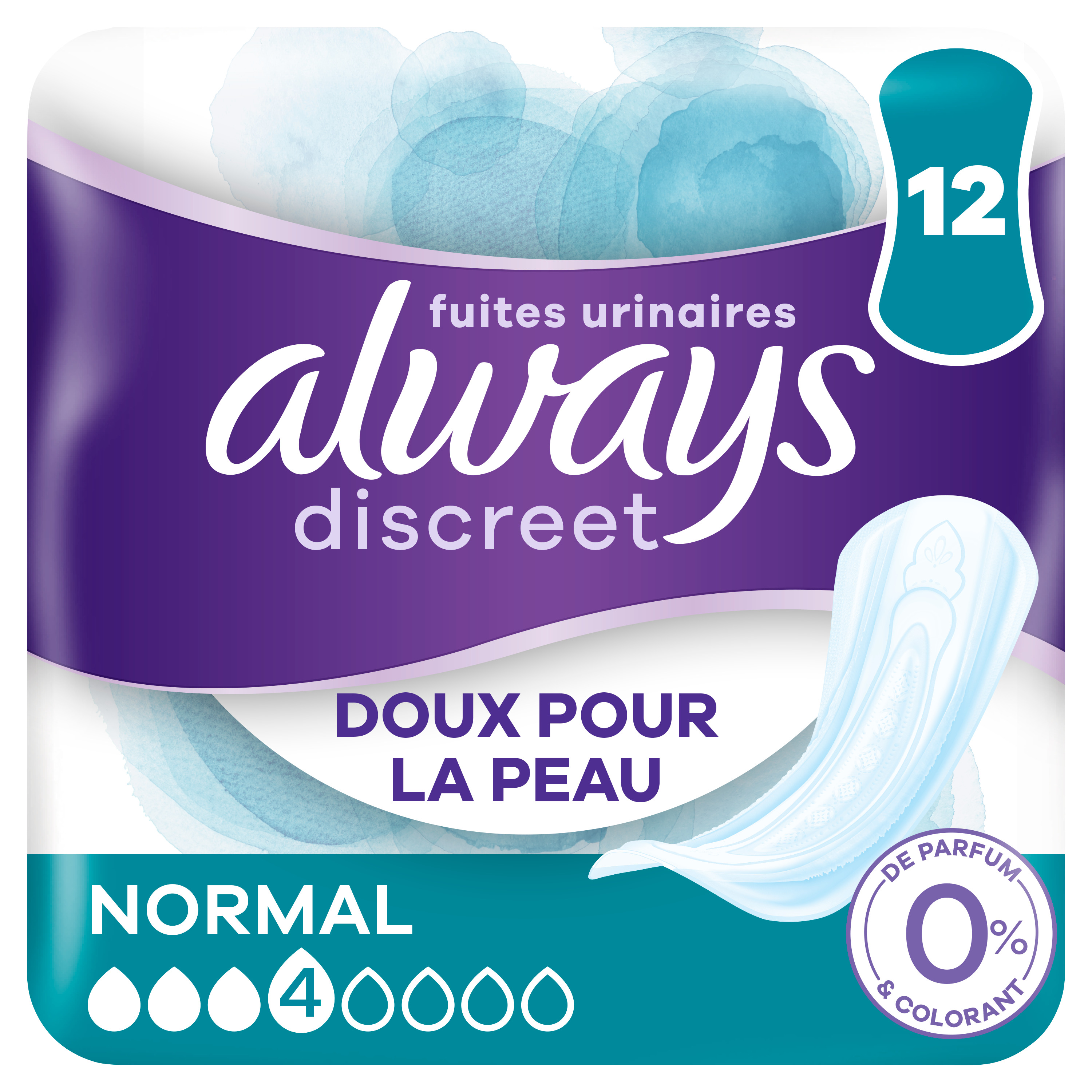 Les serviettes pour fuites urinaires Always Discreet 0% vous offrent la protection Always sans colorant et sans parfum