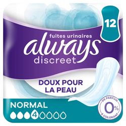 Les serviettes pour fuites urinaires Always Discreet 0% Normal sont spécialement conçues sans colorant et sans parfum. Elles offrent une protection optimale avec un cœur absorbant ultra fin afin que que vous ne vous inquiétiez plus de vos fuites. Les serviettes Always Discreet 0% Normal vous offrent une protection optimale en cas de fuites urinaires lorsque vous éternuez ou riez
