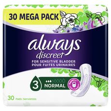 Ne laissez pas les fuites urinaires vous empêcher de vivre votre vie pleinement. Les Serviettes pour fuites urinaires Always Discreet Normal vous offrent une protection sûre que vous sentez à peine. Conçues pour s’adapter à votre corps et à votre vie, elles offrent une protection optimale avec un cœur absorbant ultra-fin unique, afin que vous vous sentiez confiante, sans vous soucier des fuites. Les serviettes Always Discreet Normal vous offrent une protection optimale en cas de fuites urinaires occasionnelles, lorsque vous éternuez ou riez.