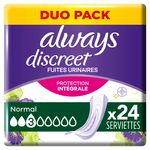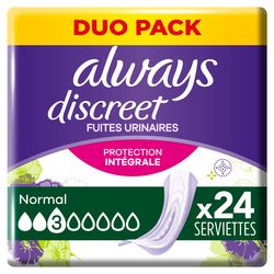 Les serviettes pour fuites urinaires Always Discreet Normal vous offrent une protection intégrale* une discrétion optimale. Chaque serviette a été conçue pour vous offrir une protection fiable contre les fuites, une neutralisation des odeurs, la technologie InstantAbsorb et une sensation douce sur la peau tout en épousant les formes de votre corps. Les serviettes Always Discreet Normal vous offrent une protection fiable et la discrétion que vous attendez en cas de fuites urinaires lorsque vous éternuez ou riez, pour que vous puissiez vous sentir en toute confiance. *Basé sur nos 5 dimensions d'une protection fiable : protection sûre contre les fuites urinaires, absorption immédiate, technologie exclusive de neutralisation des odeurs, design discret, doux pour la peau