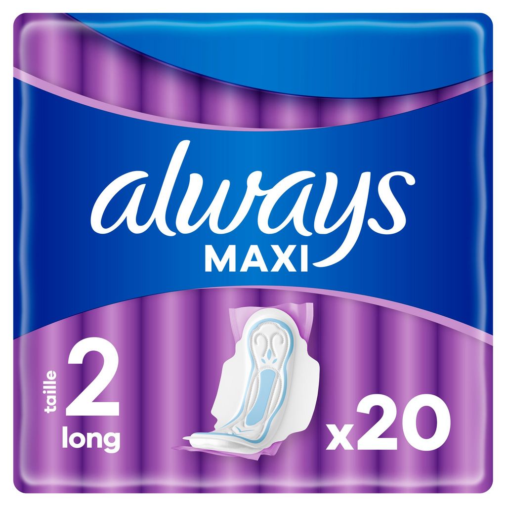 Les serviettes Always Maxi Long (taille 2) avec ailettes vous offrent une protection et un confort optimum quand vous en avez le plus besoin. La serviette Always Maxi Long est une serviette épaisse qui offre jusqu'à 100 % de protection grâce à ses barrières anti-fuites et à son cœur ultra absorbant. Pour en savoir plus sur les produits Always, veuillez consulter le site Web d'Always.