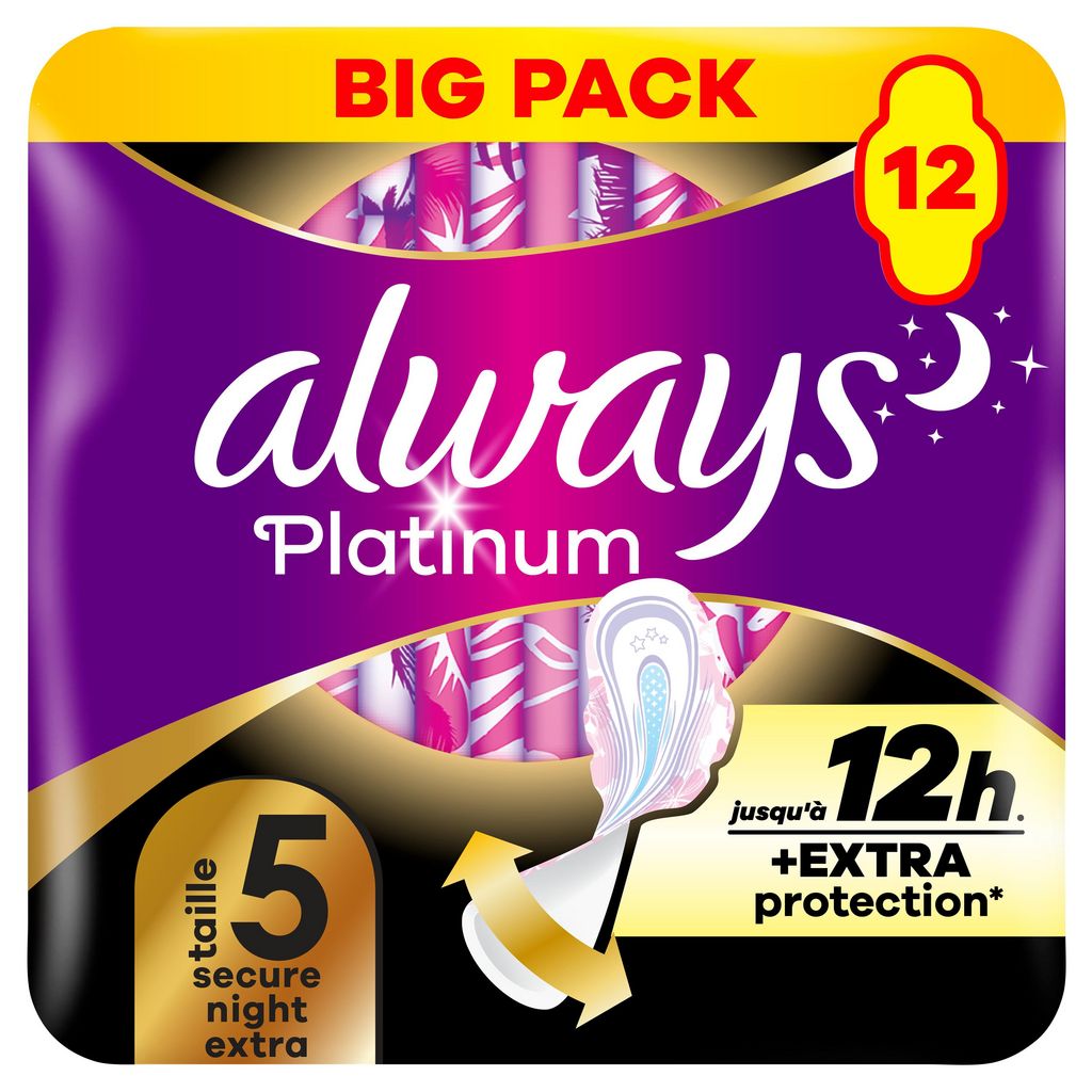 Serviettes avec voile supérieur protecteur ultra-doux pour un confort incroyable et une protection contre les fuites. Technologie InstantDry (Sec Instantanément) pour plus de confort. Design doux et flexible qui s'adapte à votre corps. Technologie OdourLock avec un parfum agréable qui neutralise les odeurs (ne contient aucun des 26 allergènes listés par l'UE). 85% plus large et plus grand à l'arrière* pour une protection supplémentaire là où vous en avez le plus besoin. Les serviettes Always Platinum avec voile supérieur protecteur ultra-doux sont conçues pour éviter les fuites, rester en place et offrir un confort optimal. Avec les serviettes Always Platinum, vous oublierez avoir vos règles. Always Platinum Secure Night Extra est recommandée pour une utillisation la nuit. 85% plus large et grande à l'arrière*, la serviette offre une protection supplémentaire contre les fuites. Essayez la taille 1, pour être protégée contre les fuites, même lorsque vous êtes active. *par rapport au Platinum taille 1