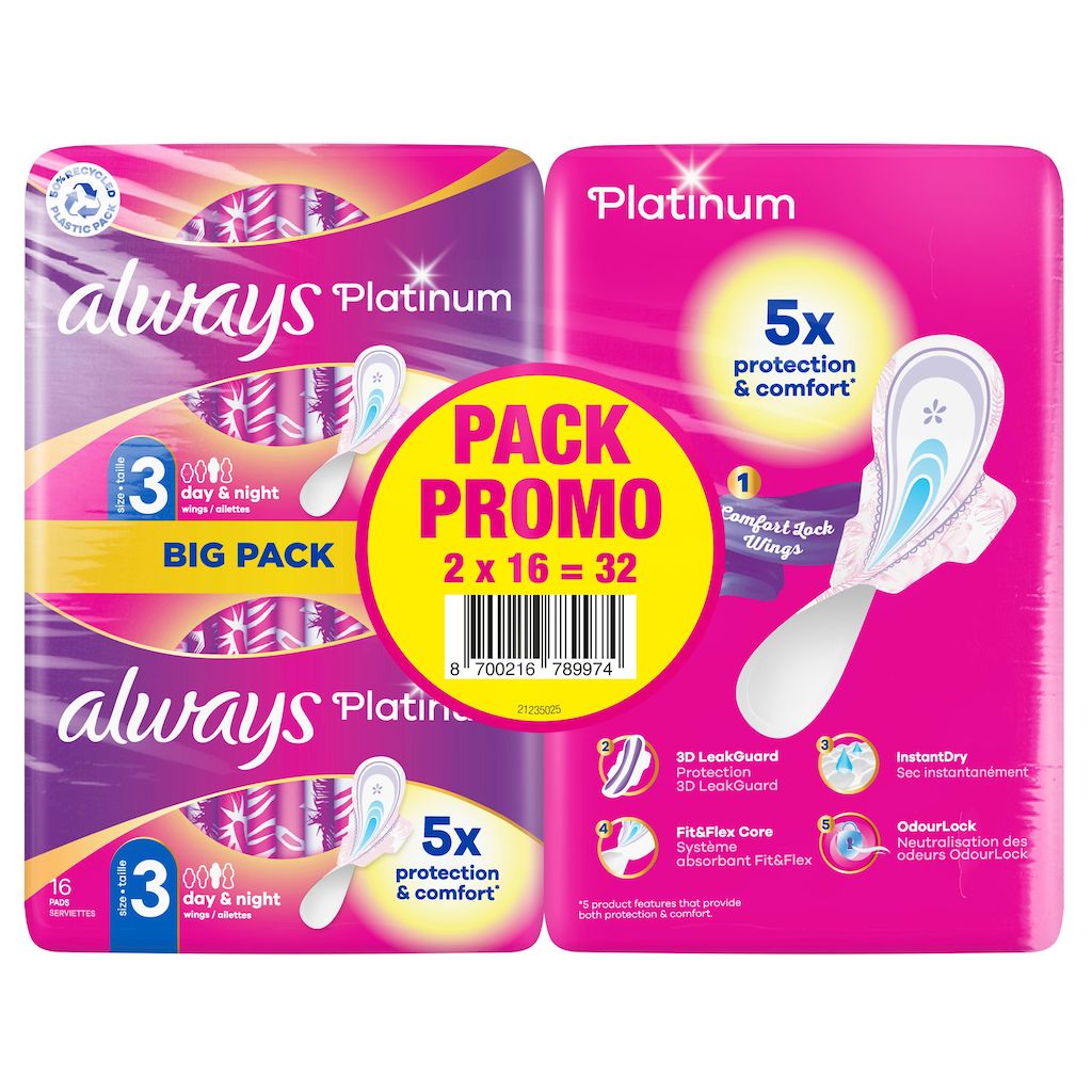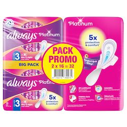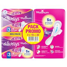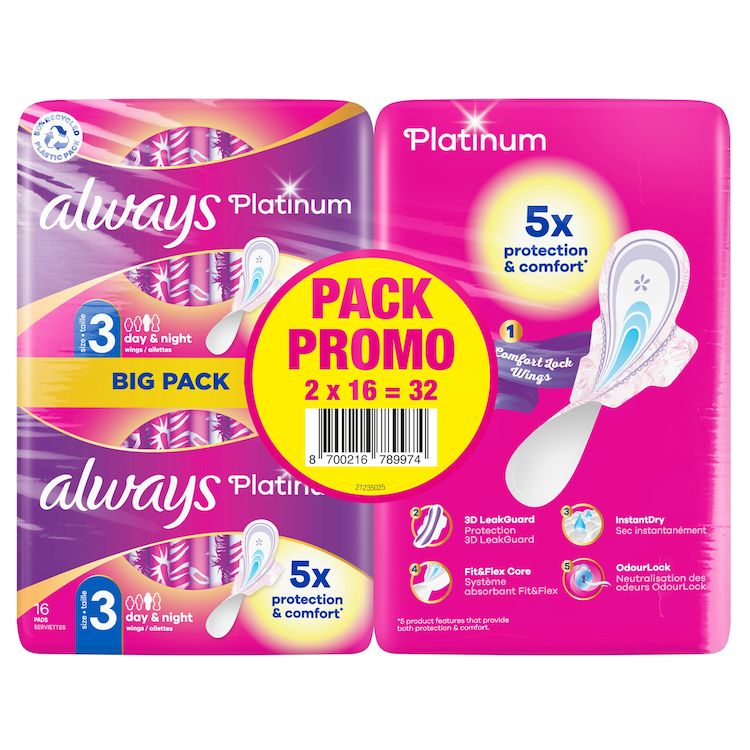 Serviettes avec voile supérieur protecteur ultra-doux pour un confort incroyable et une protection contre les fuites. Les ailettes ComfortLock sont conçues pour s'adapter parfaitement à tous les types de sous-vêtements. Design doux et flexible qui s'adapte à votre corps. Technologie OdourLock avec un parfum agréable qui neutralise les odeurs (ne contient aucun des 26 allergènes listés par l'UE). Les serviettes Always Platinum avec voile supérieur protecteur ultra-doux sont conçues pour éviter les fuites, rester en place et offrir un confort optimal. Avec les serviettes Always Platinum, vous oublierez avoir vos règles.