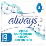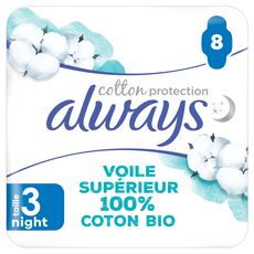 Les serviettes Always Cotton Protection prennent soin de vous avec un voile supérieur 100% coton biologique dans un emballage en papier. Les serviettes sont sans parfum. Elles ont été approuvées par les dermatologues de la Skin Health Alliance (Alliance pour la Santé de la Peau) et certifiées par Cotton Inc. Leur cœur ultra absorbant transforme le liquide en gel pour vous garantir la protection Always. Les serviettes Always Cotton Protection Night sont particulièrement adaptées aux flux moyens avec une lingerie de taille L, et aux flux abondants avec une lingerie de taille M ou L. Pour en savoir plus sur les produits Always, veuillez consulter le site Web Always.
