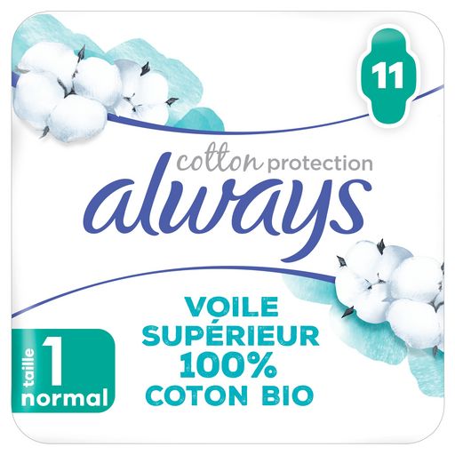 Les serviettes Always Cotton Protection prennent soin de vous avec un voile supérieur 100% coton biologique dans un emballage en papier. Les serviettes sont sans parfum. Elles ont été approuvées par les dermatologues de la Skin Health Alliance (Alliance pour la Santé de la Peau) et certifiées par Cotton Inc. Leur cœur ultra absorbant transforme le liquide en gel pour vous garantir la protection Always. Les serviettes Normal sont particulièrement adaptées aux flux légers avec une lingerie de taille S ou M ou aux flux moyens avec une lingerie de taille S. Pour en savoir plus sur les produits Always, veuillez consulter le site Web Always.