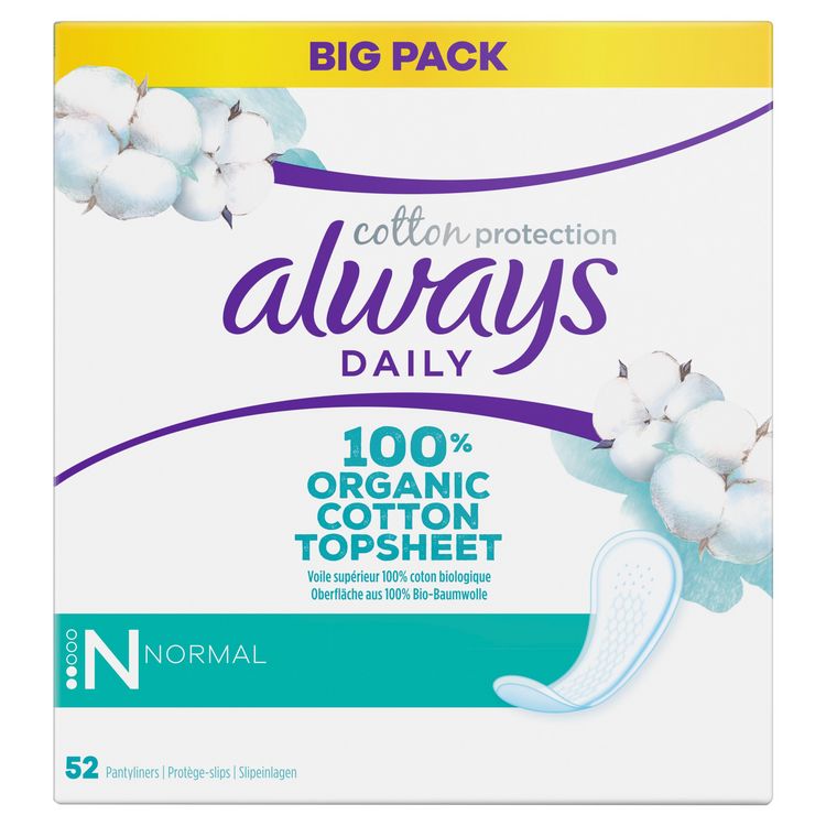 Les protège-slips Always Daily Cotton Protection Normal ont un voile supérieur composé à 100 % de coton biologique. Par ailleurs, ils sont sans parfum. Ils sont fins et flexibles, conçus pour être confortables et sont dotés d'un cœur absorbant. De plus, ils ont un design micro-aéré. Ces protège-slips ont été approuvés par les dermatologues de la SHA (Skin Health Alliance) et sont certifiés par Cotton Inc. Pour en savoir plus sur nos produits, veuillez consulter notre site Web.