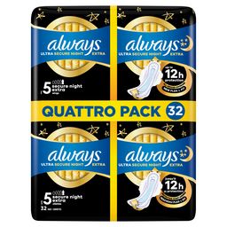 Exigez une bonne nuit de sommeil ininterrompue avec une protection jusqu'à 12 heures : Les serviettes Always Ultra Secure Night Extra (taille 5) avec ailettes sont conçues avec 3 éléments de protection pour vous éviter de vous lever la nuit en cas de fuites ou pour changer votre serviette. Une partie avant 9% plus large et une partie arrière 85% plus large*, associés à notre technologie AntiFuites, assurent une protection complète pour éviter les fuites pendant les nuits lors de vos règles. Le système InstantAbsorb absorbe le liquide en quelques secondes et éloigne l'humidité de la peau. Elles possèdent également la technologie OdourLock qui neutralise les odeurs, afin que vous vous sentiez fraîche et propre. Dormez, Always Ultra vous offre une triple protection. Les serviettes sont approuvées par les dermatologues de la Skin Health Alliance. Trouvez la serviette qui vous va avec Always MyFit, un système de taille personnalisé qui vous aide à trouver la meilleure protection Always pendant vos règles, en fonction de votre flux et de votre taille de lingerie.