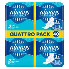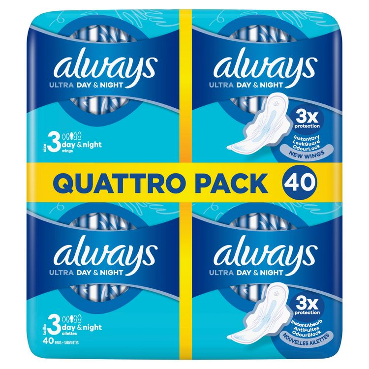 Ne dites oui qu'à une triple protection avec les serviettes Jour et nuit (Taille 3) Always Ultra avec ailettes. Les serviettes Always absorbent le flux menstruel en quelques secondes grâce à leur technologie InstantAbsorb et aident à prévenir les fuites et les odeurs grâce aux technologies AntiFuites et OdourBlock. Leurs ailettes ComfortLock uniques sont conçues pour s'adapter encore mieux à tout type de sous-vêtement (vs. produit précédent). Pour une protection supplémentaire la nuit, essayez Always Ultra Taille 5. Les serviettes Always sont approuvées par les dermatologues de la Skin Health Alliance