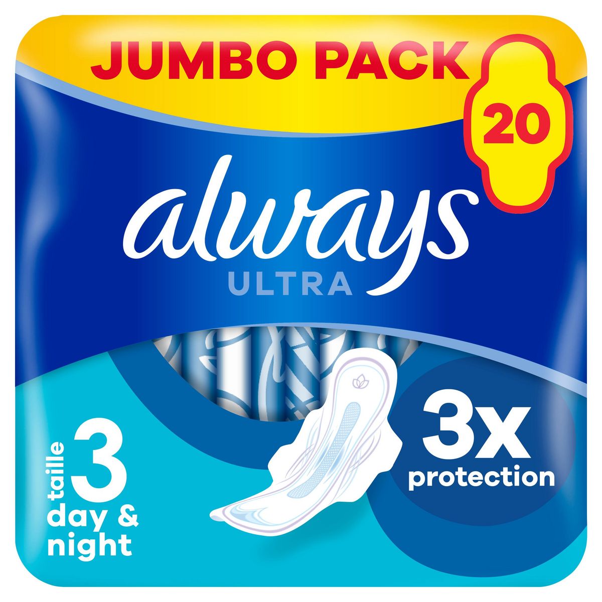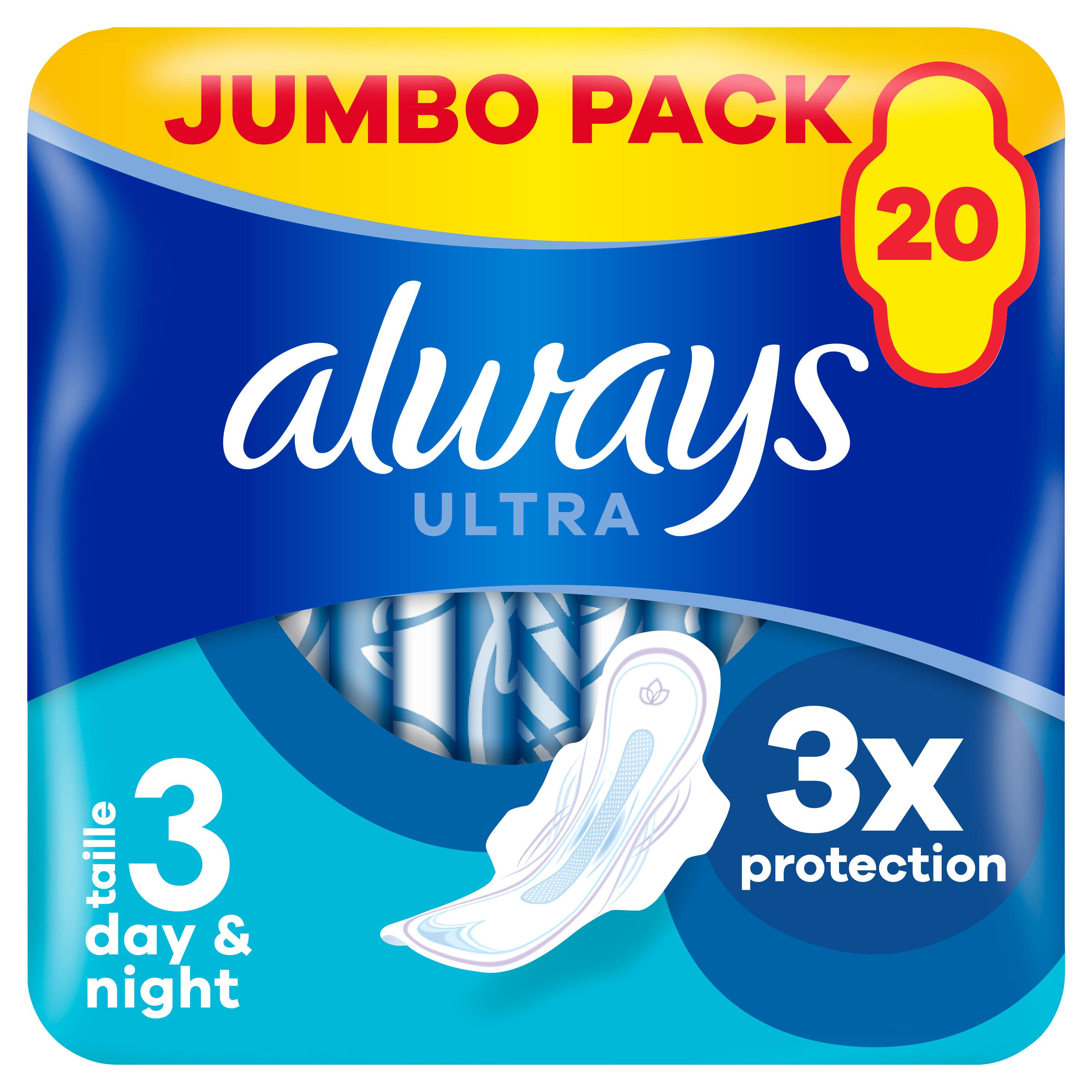 Ne dites oui qu'à une triple protection avec les serviettes Jour et nuit (Taille 3) Always Ultra avec ailettes. Les serviettes Always absorbent le flux menstruel en quelques secondes grâce à leur technologie InstantAbsorb et aident à prévenir les fuites et les odeurs grâce aux technologies AntiFuites et OdourBlock. Leurs ailettes ComfortLock uniques sont conçues pour s'adapter encore mieux à tout type de sous-vêtement (vs. produit précédent). Pour une protection supplémentaire la nuit, essayez Always Ultra Taille 5. Les serviettes Always sont approuvées par les dermatologues de la Skin Health Alliance