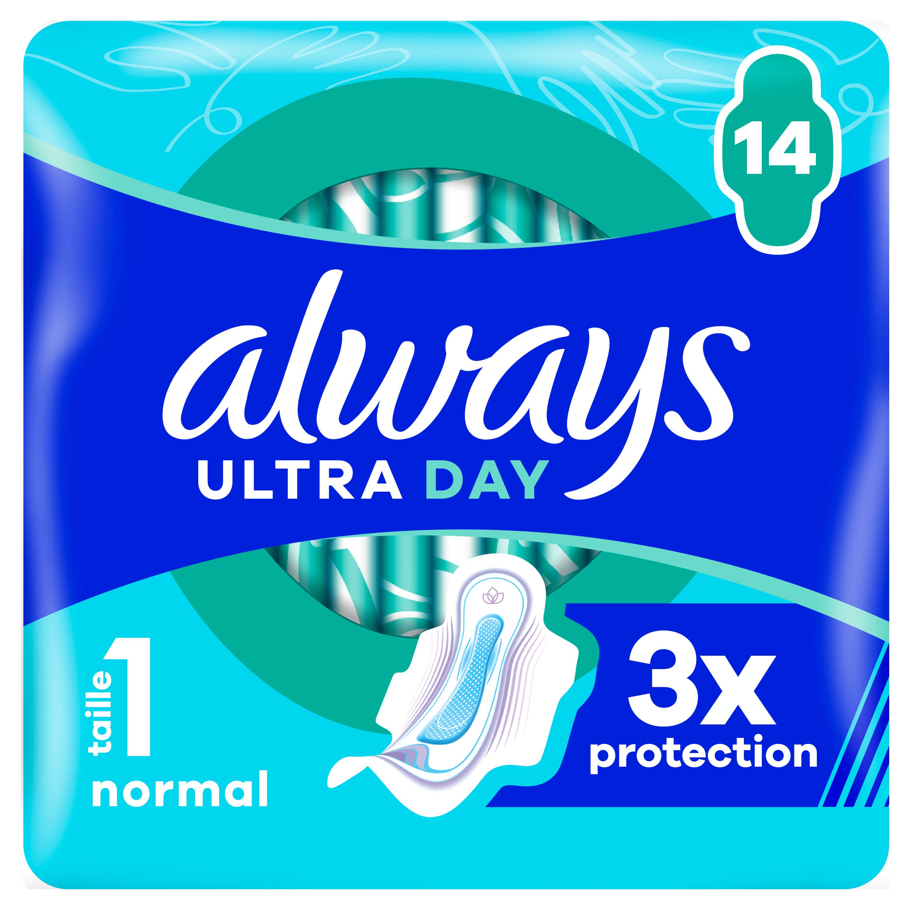 Ne dites oui qu'à une triple protection avec les Always Ultra Normal serviettes menstruelles périodiques avec ailettes Normal (taille 1). Les serviettes menstruelles Always avec leur voile supérieur absorbant et doux au toucher absorbent le flux menstruel en quelques secondes grâce à leur technologie InstantAbsorb et aident à prévenir les fuites et les odeurs grâce aux technologies AntiFuites et OdourBlock. Les ailettes ComfortLock sont conçues pour s'adapter à tout type de lingerie. Pour une protection supplémentaire la nuit, essayez les tailles Always Nuit. Les serviettes sont approuvées par les dermatologues de la Skin Health Alliance.