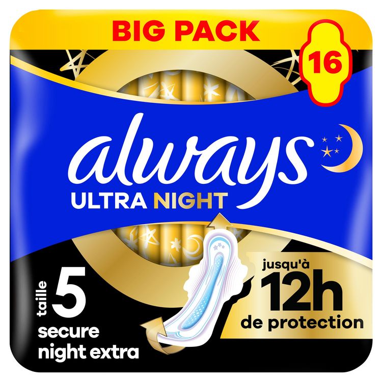 Exigez une bonne nuit de sommeil ininterrompue avec une protection jusqu'à 12 heures : Les serviettes Always Ultra Secure Night Extra (taille 5) avec ailettes sont conçues avec 3 éléments de protection pour vous éviter de vous lever la nuit en cas de fuites ou pour changer votre serviette. Une partie avant 9% plus large et une partie arrière 85% plus large*, associés à notre technologie AntiFuites, assurent une protection complète pour éviter les fuites pendant les nuits lors de vos règles. Le système InstantAbsorb absorbe le liquide en quelques secondes et éloigne l'humidité de la peau. Elles possèdent également la technologie OdourLock qui neutralise les odeurs, afin que vous vous sentiez fraîche et propre. Dormez, Always Ultra vous offre une triple protection. Les serviettes sont approuvées par les dermatologues de la Skin Health Alliance. Trouvez la serviette qui vous va avec Always MyFit, un système de taille personnalisé qui vous aide à trouver la meilleure protection Always pendant vos règles, en fonction de votre flux et de votre taille de lingerie.